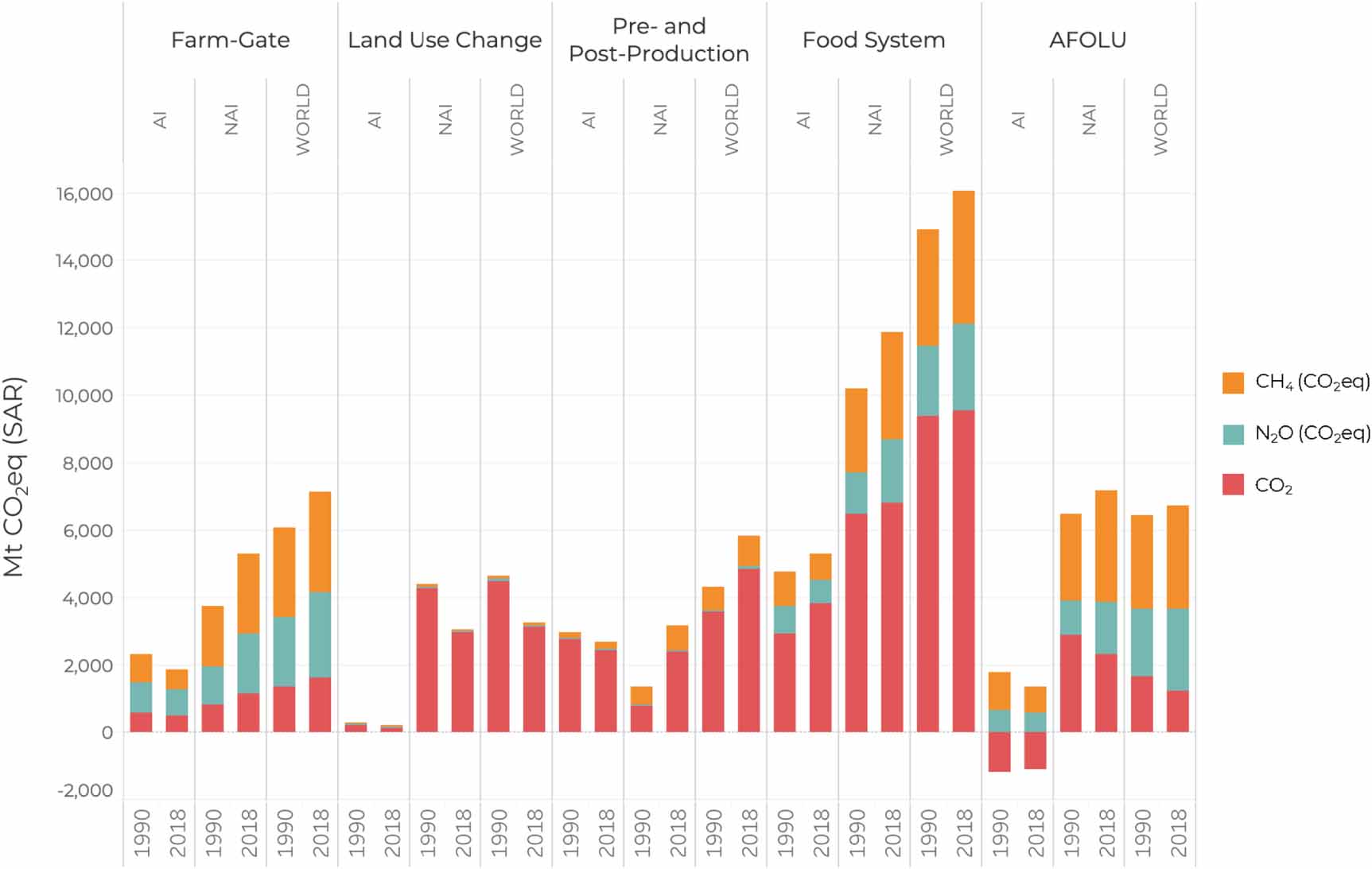 Figure 3. Relevant food and agriculture emissions groupings, by trace gas (CH4, N2O, CO2 and CO2eq) and regional aggregation (AI = Annex I parties; NAI = non-Annex I parties). Aggregates include those for: food system, agricultural land, pre- and post-production, and land use change. AFOLU emissions are provided for comparison.