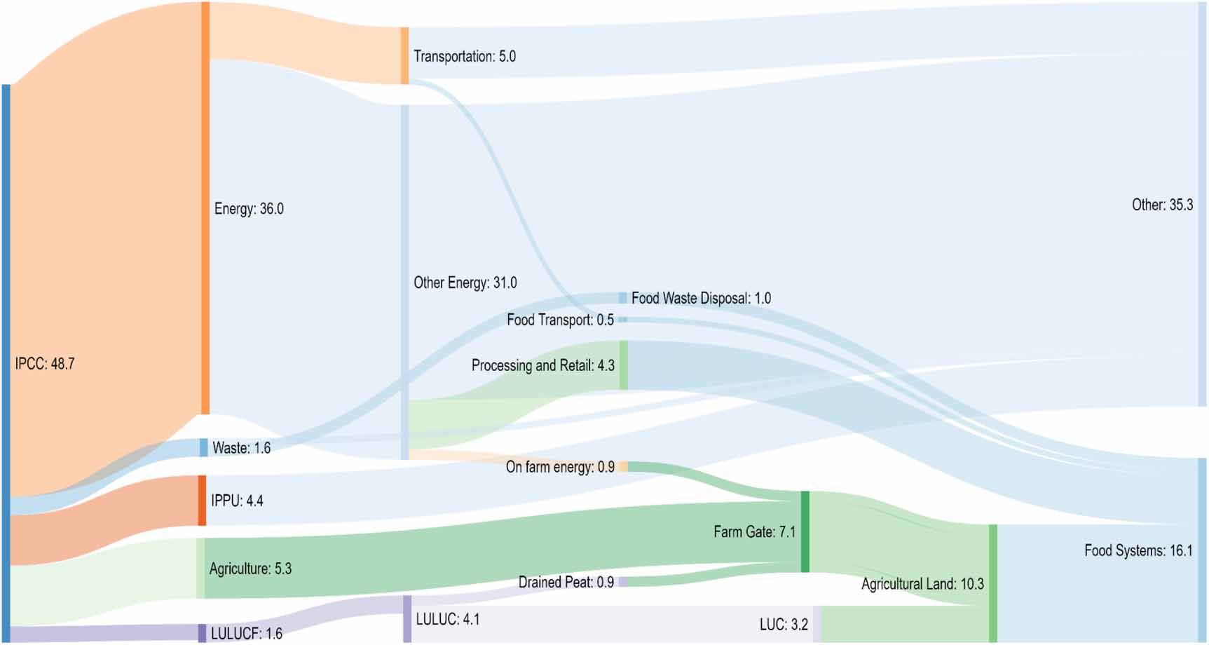Figure 5. Sankey diagram of world total anthropogenic emissions flows from IPCC sectors to food system and non-food groupings, for the year 2018. Produced with free SANKEYMatic software, available at http://sankeymatic.com/.
