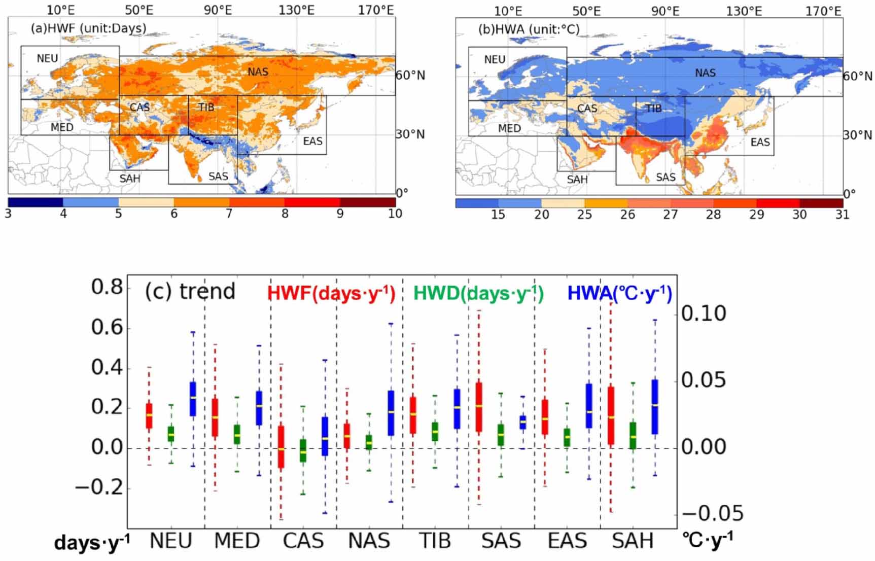 Figure 1. Geographical distribution of the mean value of (a) HWF (unit: days), (b) HWA (unit: °C) for summers during 1979–2017. The color bar in (b) is non-uniform to focus on high values. (c) Box and whisker plot of the liner trend of summer HWF (red boxes), HWD (green boxes), and HWA (blue boxes) in eight Giorgi regions (Giorgi and Francisco 2000) during 1979–2017 from the 0.25 × 0.25 ERA-5 dataset. For each boxplot, the bottom and top of the boxes are the lower and upper quartiles, respectively, the bar near the middle of the box is the median, and the whiskers show the 5% and the 95% values.