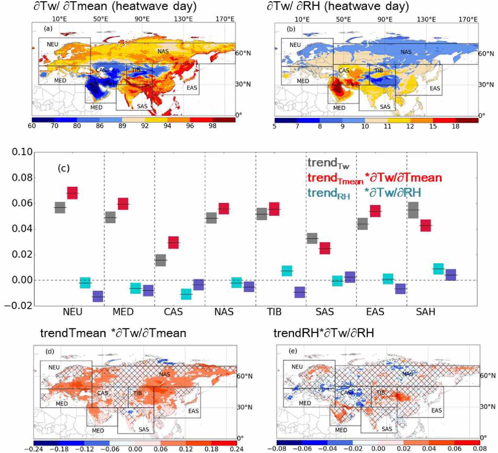 Standard image High-resolution imageTo measure quantitatively the contributions of changes in Tmean and RH to changes in Tw (see equation (4)), both the sensitivity of Tw and the changes of Tmean and RH were considered (figures 4(c)–(e)). Tmean is the largest driver of changes in Tw though the quantitative contribution depends on both the sensitivity of Tw to temperature and the change in temperature (figures 4(c)–(e)). Considering Eurasia as a whole, changes in Tw are largely driven by changes in temperature, but the contributions of temperature and humidity to the HWA changes exhibit significant regional differences (figure 4(c)). Over the eight regions, the dominant driver of increasing median Tw on heatwave days is dry-bulb temperature with only small contributions from RH trends. In CAS drying offsets the warming effect leading to only small changes in Tw. The Mediterranean region also shows a drying effect which reduces the temperature driven increase in Tw. In contrast, the TIB region shows a modest increase in Tw over the dominant temperature driven increase from changes in RH.