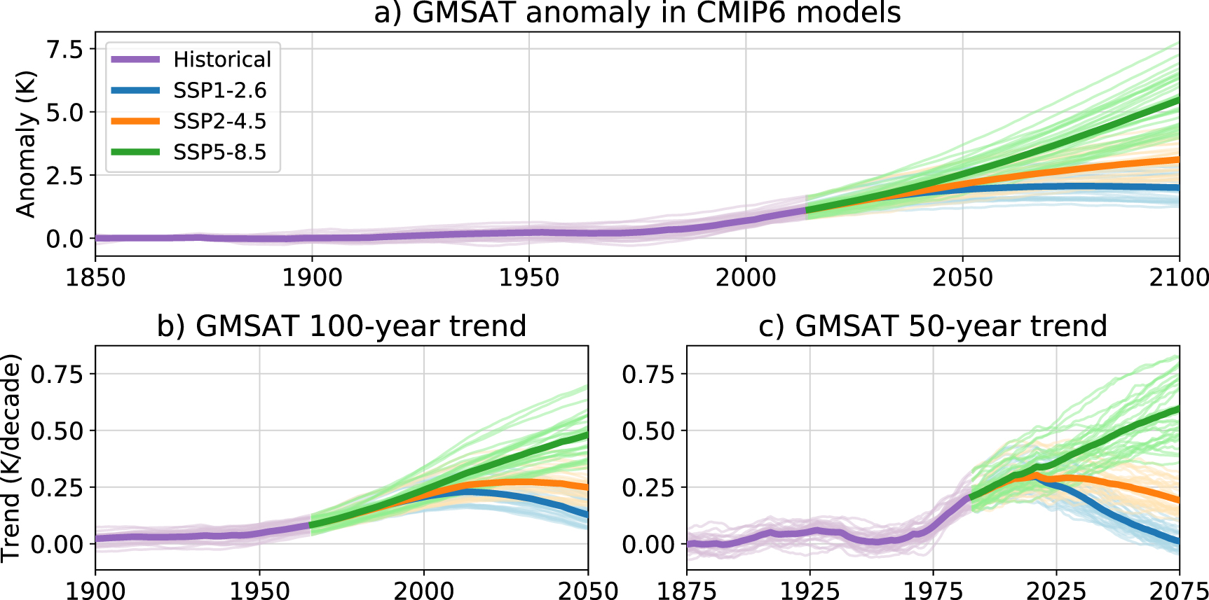 Figure 1 shows the development of the GMSAT anomalies in the models listed in table S1, in historical simulations and under three different future scenarios. In SSP1-2.6, the temperature stabilizes during the 21st century and the 50- and 100-year trends reach their maximum in the early 2000 s, while in SSP2-4.5 trends are reduced later and GMSAT is still increasing in 2075, and in SSP5-8.5 the 50- and 100-year trends in temperature continue to increase and the temperature anomalies grow increasingly towards the end of the 21st century.