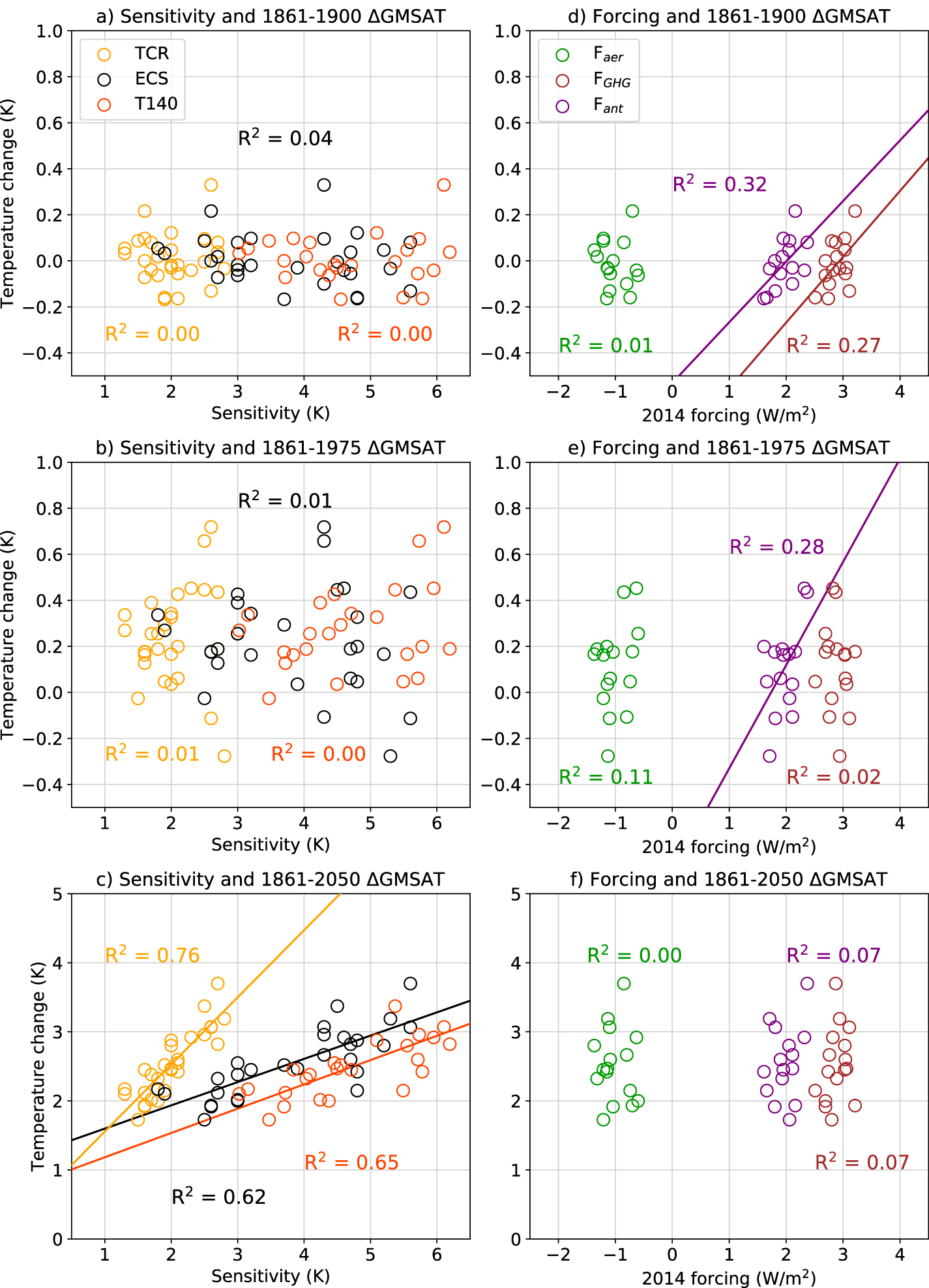 Figure 2. Scatterplots of GMSAT and climate sensitivity indices (a)–(c) and 2014 forcings (d)–(f) in SSP5-8.5. Temperature anomalies represent the change from 1861 to 1900 (a), (d), 1975 (b), (e), and 2050 (c), (f), respectively. Linear fits are shown in the cases where the correlation is non-zero at 95% significance (i.e. p-value is lower than 0.05), and the coefficient of determination (R2) is noted for each fit. Note the different scale on the y-axis in the bottom row.