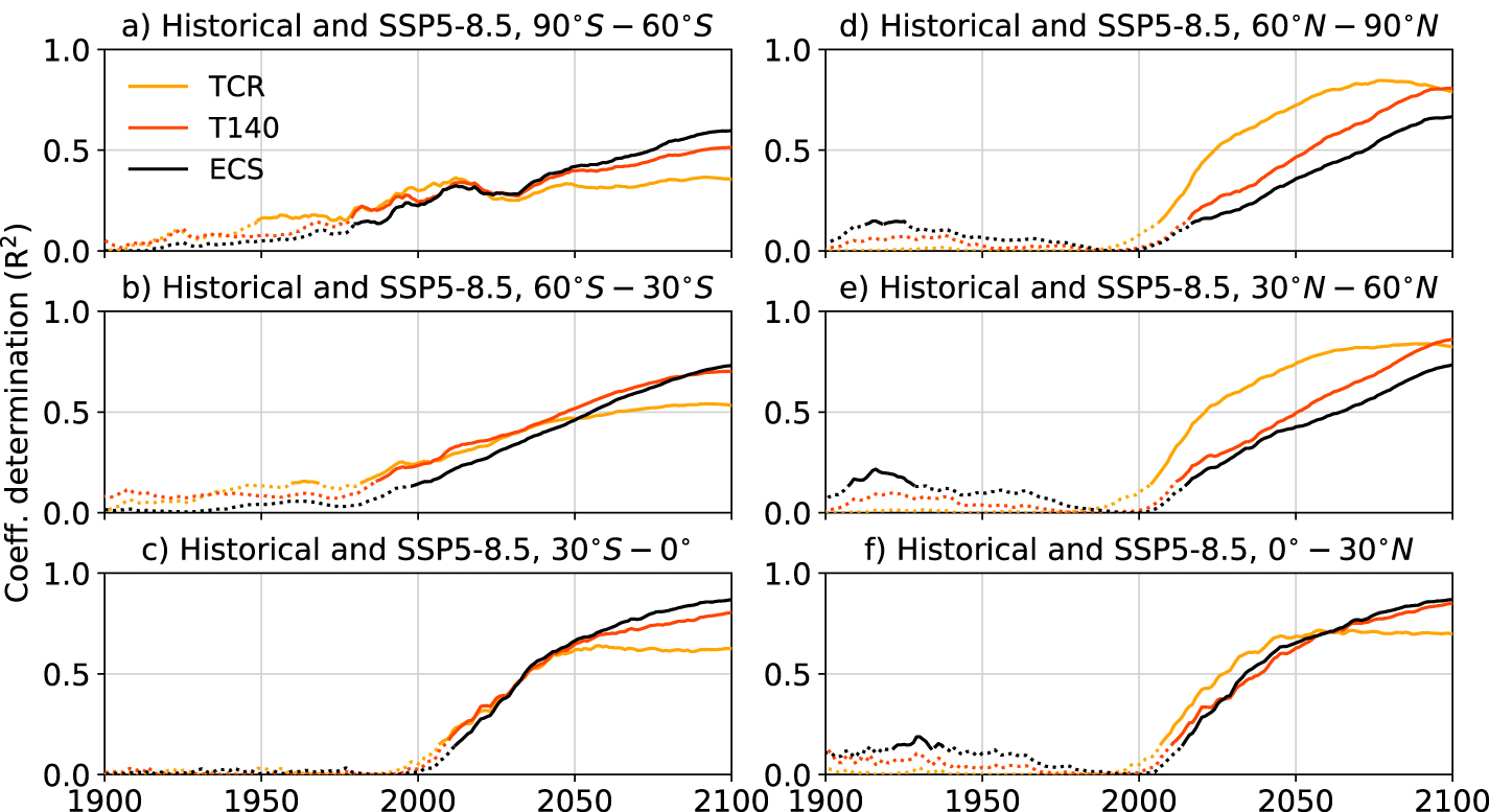 Figure 4. R2 between temperature anomaly and sensitivity indices and 2014 forcings, respectively, for SSP5-8.5, in six different latitude bands representing SH and NH high latitudes (a), (d), SH and NH mid-latitudes (b), (e) and SH and NH tropics (c), (f). Time series from 1900 to 2100. Solid lines indicate non-zero correlation at 95% significance (i.e. p-value is lower than 0.05). Prior to 1900 correlations are not significant.