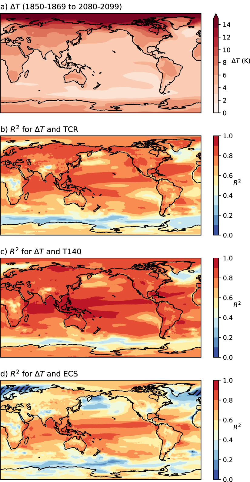 Figure 5. (a) Surface air temperature change between 1850–1869 and 2080–2099 under SSP5-8.5 (ΔT), multimodel mean for 29 CMIP6 models (see table S1). (b)–(d) R2 for the correlation between gridded ΔT and climate sensitivity metrics TCR, T140, and ECS, respectively. Stippling indicates that correlations are not significant at the 95% confidence level.