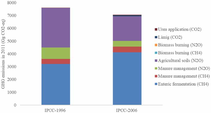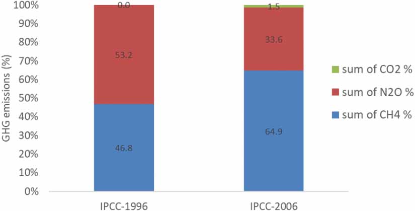 Standard image High-resolution imageFigure 3. Contribution of CO2, CH4 and N2O emissions to total agricultural GHG emissions for the year 2011 estimated with IPCC-1996 and IPCC-2006 guidelines.