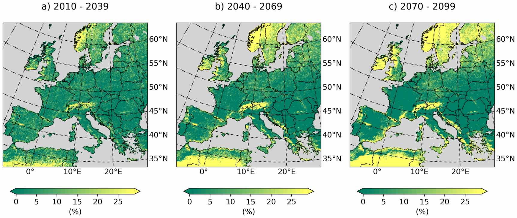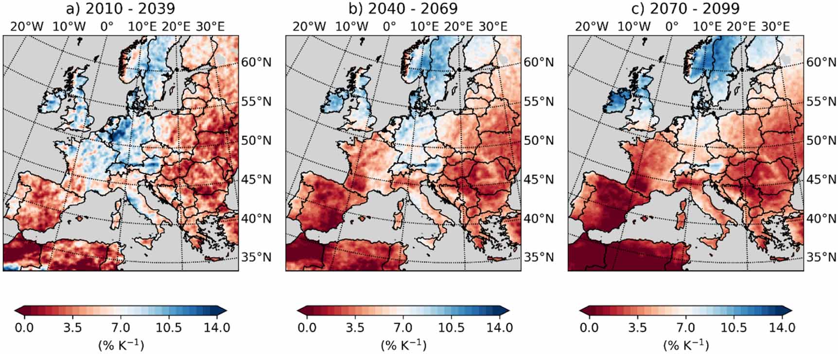 Figure 4. Clausius–Clapeyron scaling (CC scaling) of the median of the 10 year return levels of 3-hourly precipitation over Europe compared to 1980–2009, calculated for the 50 CRCM5-LE members and near (a), mid (b) and far future (c).