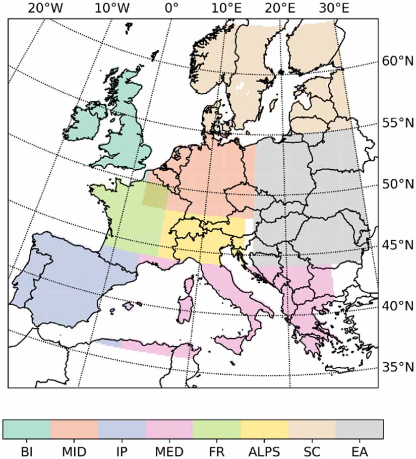 Figure 5. European sub-regions defined by Christensen and Christensen (2007) consisting of the British Isles (BI), central Europe (MID), Iberian Peninsula (IP), Mediterranean (MED), France (FR), Alps (ALPS), Scandinavia (SC), and eastern Europe (EA). Reprinted by permission from Springer Nature Customer Service Centre GmbH: Springer Nature, Climatic Change, A summary of the PRUDENCE model projections of changes in European climate by the end of this century, Christensen and Christensen (2007), Copyright 2007.