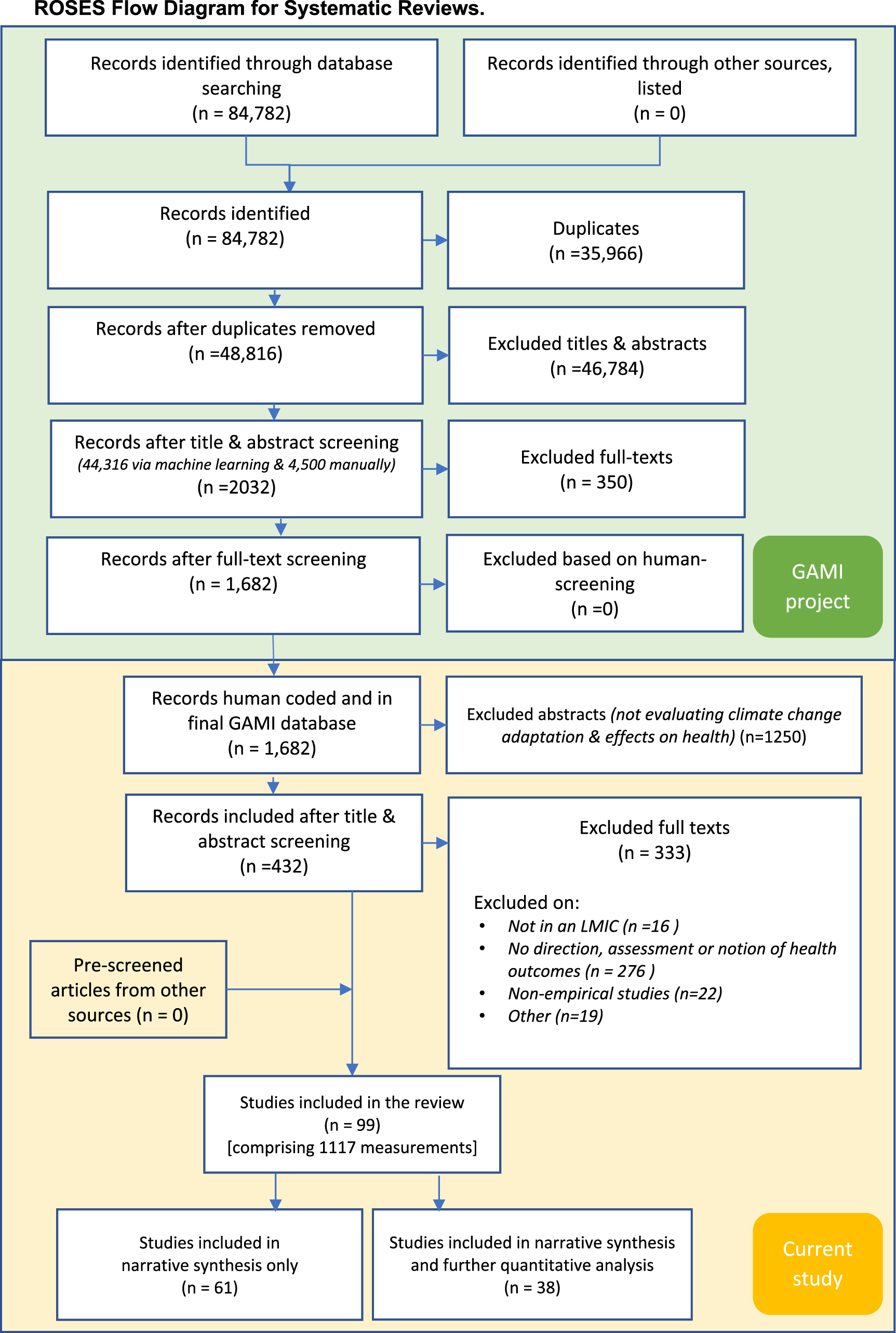 Figure 1. ROSES diagram of literature screening. Screening steps in the green coloured area were part of the GAMI, and the screening steps in the yellow area were for the current study.