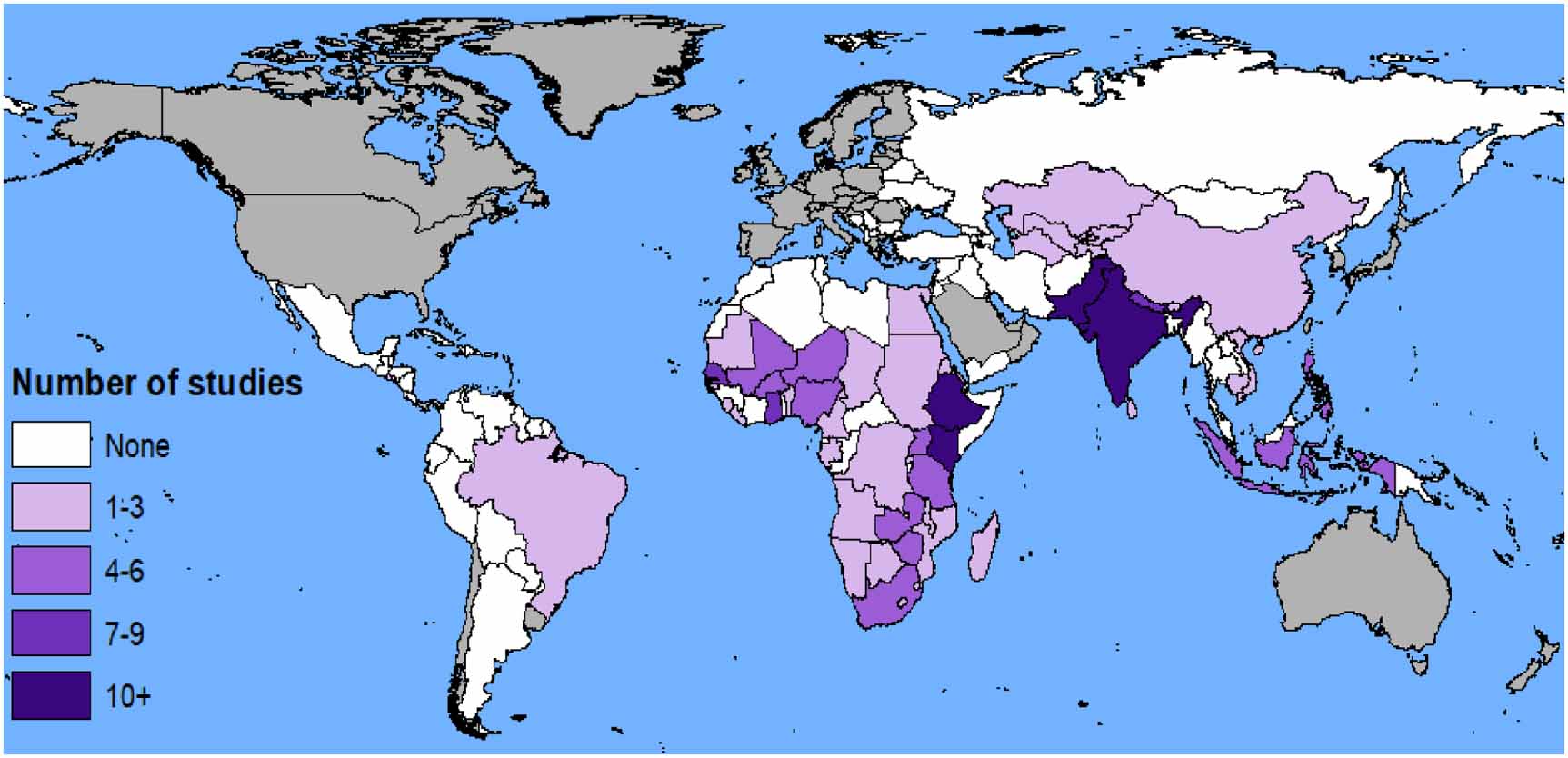 Figure 4. Global distribution of included studies and their relative abundance. (The review did not cover high income countries [in grey]).