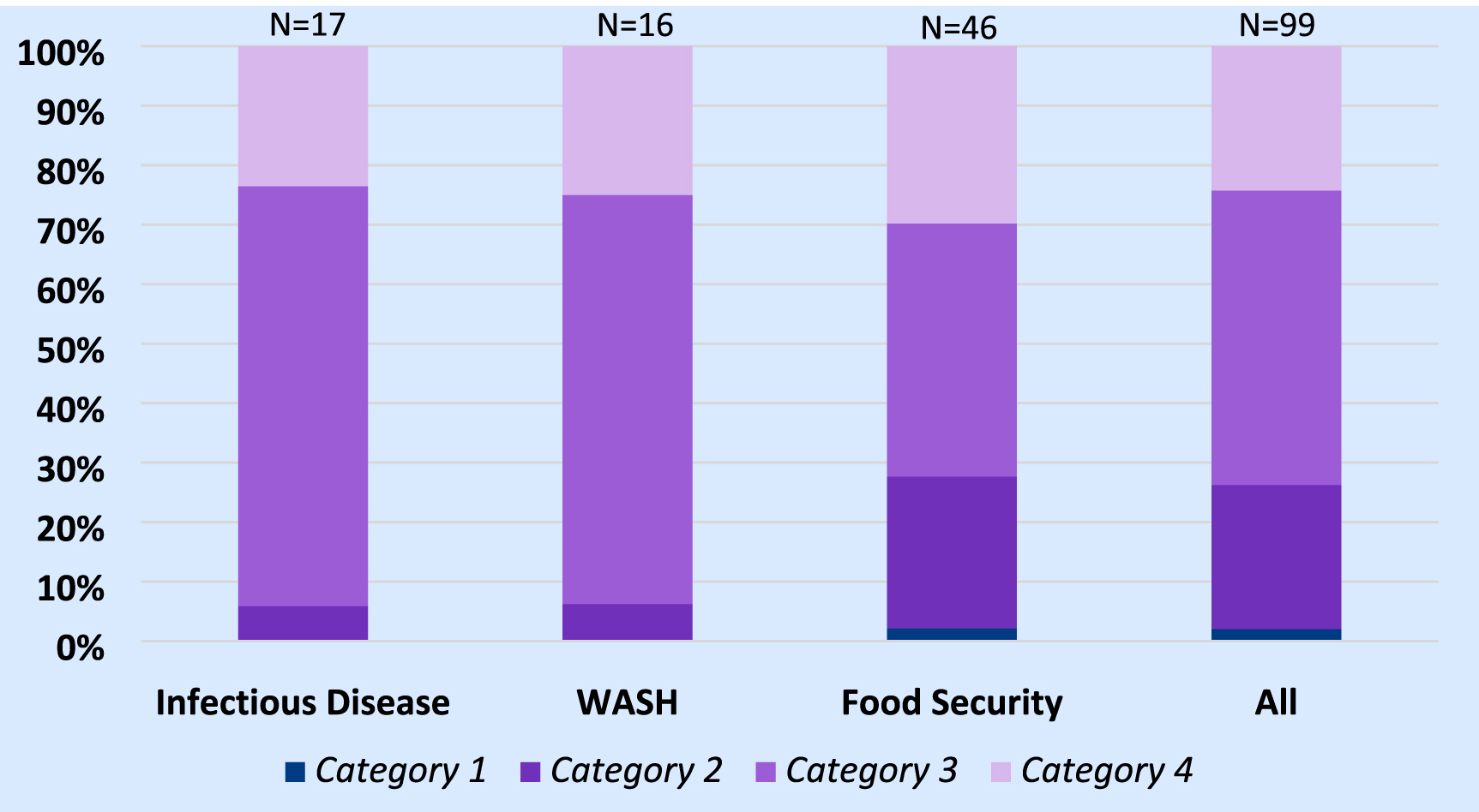 We identified two studies with a 'category 1' study design, and a relatively small number (n = 24) of studies assessed as category 2. The majority of studies were assessed as 'category 3' and 'category 4' study designs (49 and 24 studies, respectively). Studies reporting on food security showed the highest proportion of 'category 1' and 'category 2' study, and these typically reported more contextual details as well as more comprehensive quantitative analysis of the effects on health of the evaluated climate change adaptation responses (figure 5).