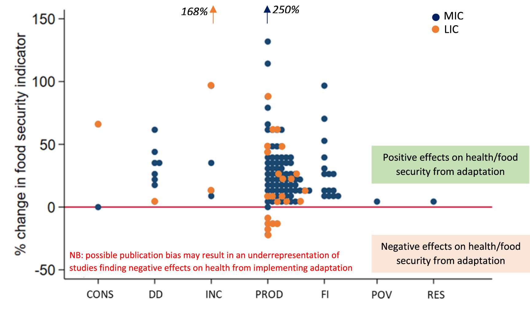 Figure 6. The effect on food security indicators of climate change adaptation strategies (expressed in per cent change compared to non-adaptors or baseline measurements). Indicators related to: CONS = consumption, DD = dietary diversity, INC = income, PROD = production, FI = food insecurity; POV = poverty, RES = resilience. MIC = middle income country; LIC = low income country.