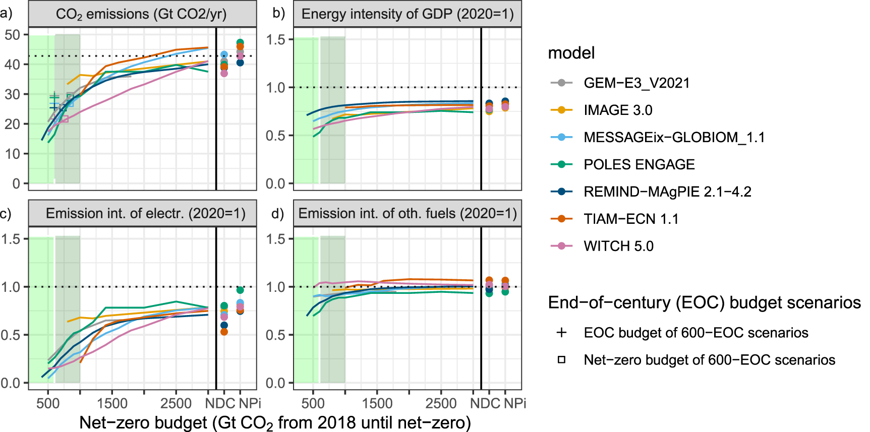 Figure 2. 2030 CO2 emissions and changes in energy and emissions intensity indicators from 2020 to 2030 in immediate net-zero budget scenarios, as well as for the NDC and NPi scenarios. The dashed line denotes the estimated 2019 emissions (Friedlingstein et al 2019) and the 2020 model value, respectively. Supplementary figure S2 shows that GDP growth, the missing component of the commonly used Kaya decomposition of emission trends, differs slightly across scenarios.