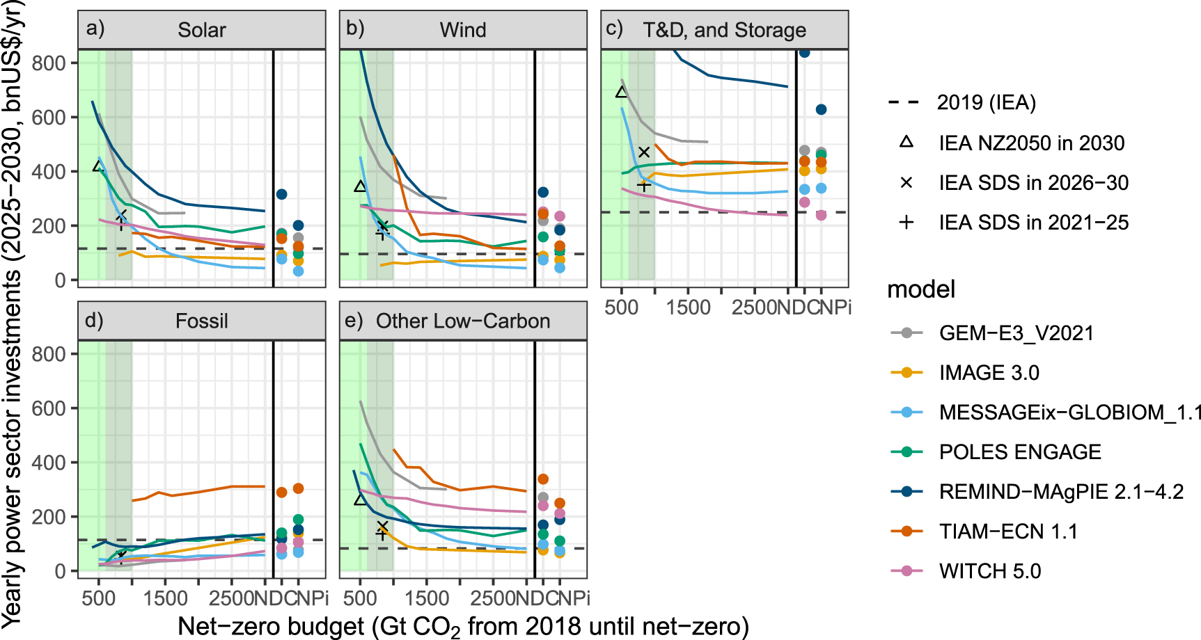 Figure 4. Average yearly power sector investments by energy technology category (2025–2030), in immediate net-zero budget scenarios, as well as the NDC and NPi scenarios. Other low-carbon includes nuclear, biomass, and hydro, plus geothermal and ocean energy for those models that include these options (see supplementary figure S5 for the corresponding plot of these individual options and supplementary figure S13 for a variant of this figure with additional sensitivity scenarios including a COVID-19 shock on near-term GDP projections).