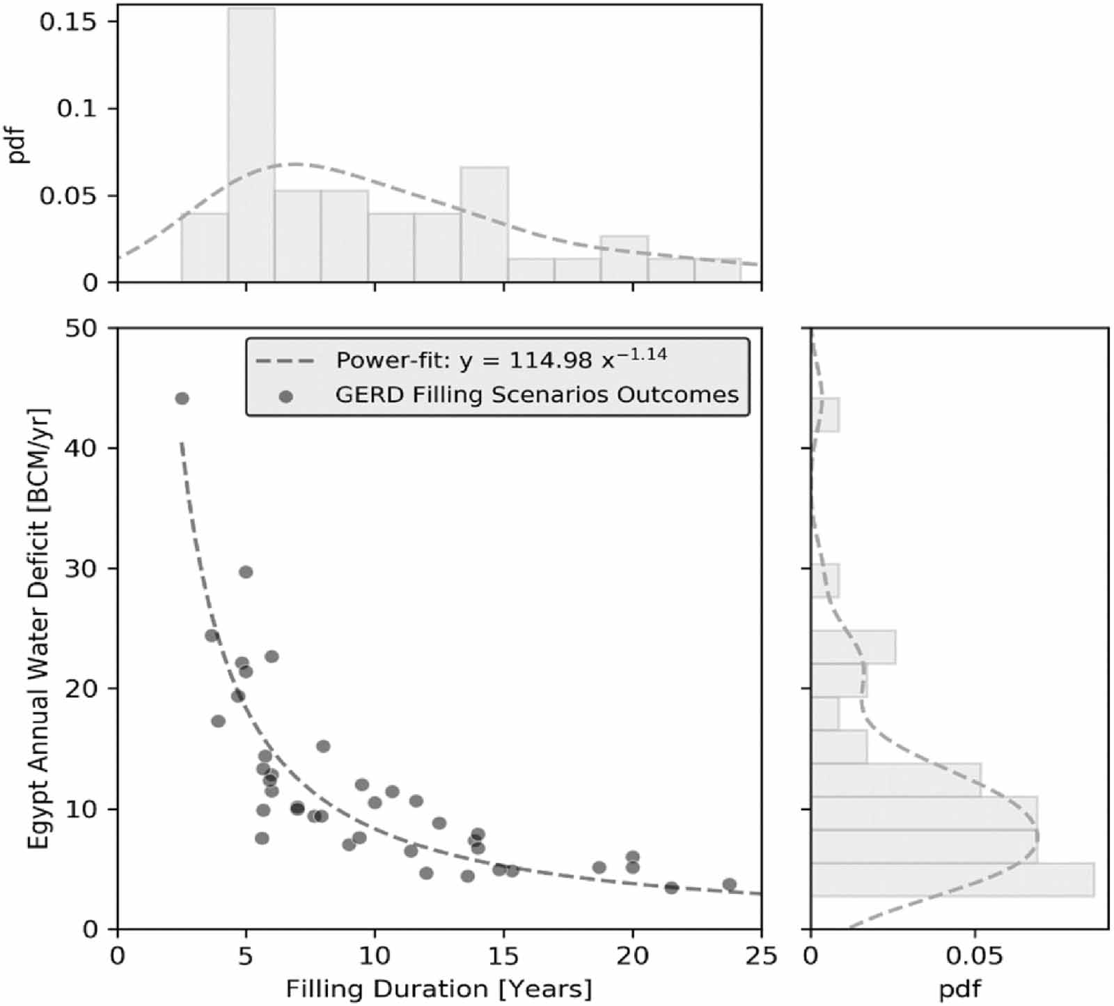 Figure 1. Egypt's total water budget deficit under the different GERD published filling scenarios. Top and right plots describe the estimated probability distribution function (pdf) of each variable (Gaussian kernel density estimate), respectively.
