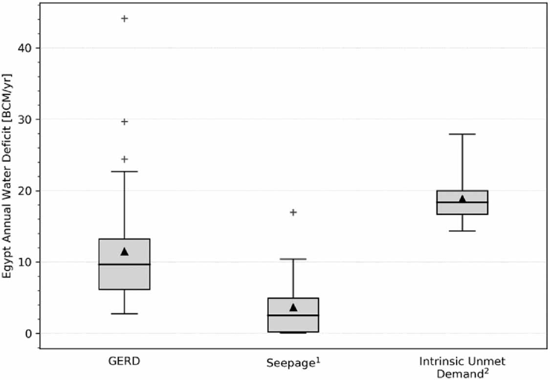 Standard image High-resolution imageFigure 2. The three components defining the annual total water budget deficit for Egypt during the GERD filling period by source considered in our study. Note that for each box-plot, the line inside the box represents the median, the triangle delineates the mean (also referred to as average), the box edges represent the 25th and 75th percentiles, the whiskers extend to the most extreme data points not considered outliers, and outliers are plotted individually in crosses. References: 1Liersch et al (2017); 2Mazzoni et al (2018). The left box (GERD) refers to the annual water deficit induced by water impounding in the GERD reservoir during the filling period (numbers are statistically derived from available scenarios in table 1. The middle box (Seepage) refers to the annual water deficit resulting from seepage losses in the GERD reservoir after 1Liersch et al (2017). The right box refers to the current intrinsic water deficit in Egypt after 2Mazzoni et al (2018). The sum of the median value of the three is referred to as the annual total water budget defiecit.