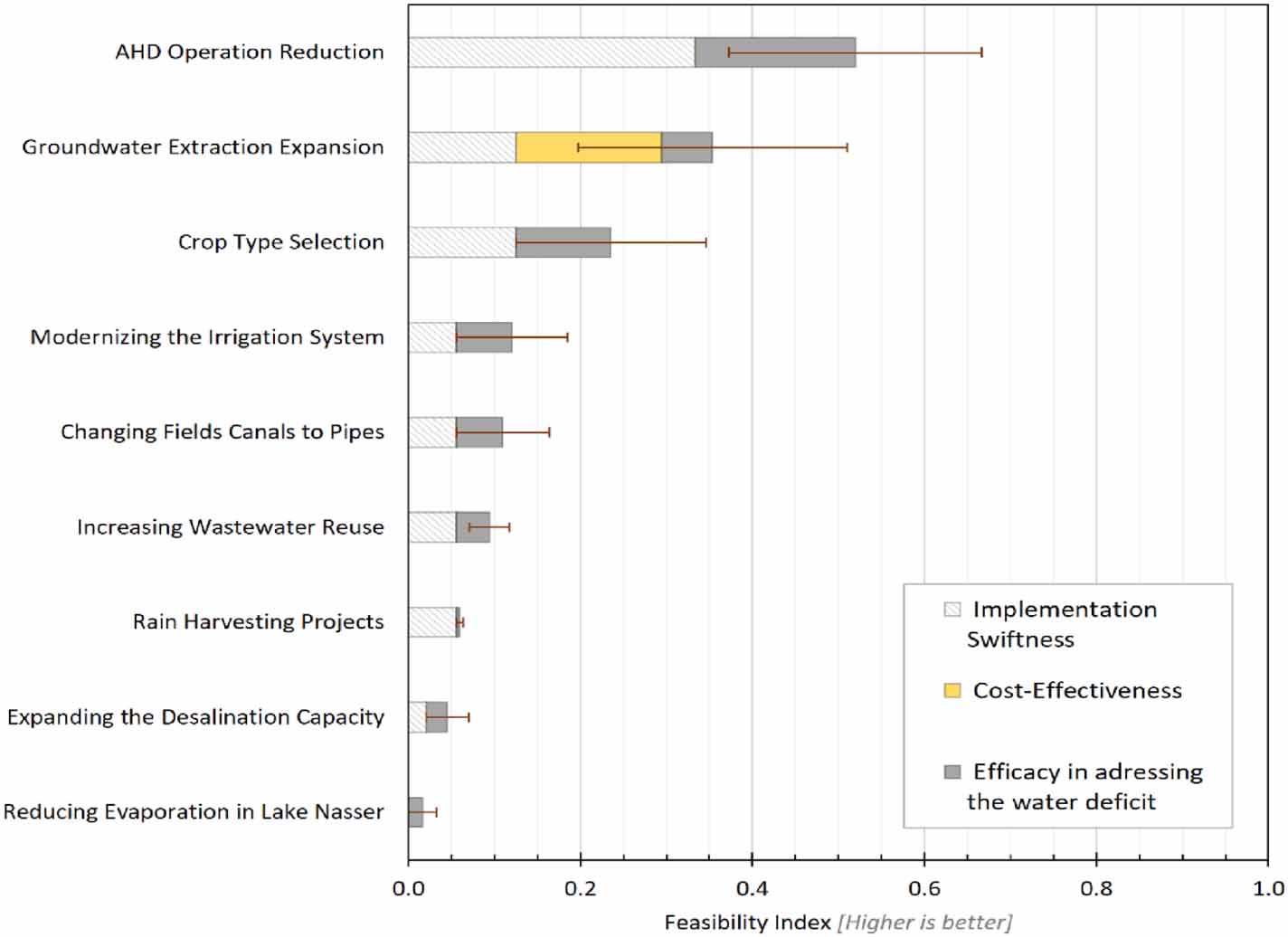 In table 2, we summarize what are all the most plausible proposed strategies that Egypt could undertake to mitigate the short-term and temporary effects of the GERD filling in terms of water deficit in particular: AHD Operation reduction (i.e. AHD rules to be readjusted to cope with the water reduction), groundwater extraction expansion, crop type selection, modernizing the irrigation system, changing fields canals to pipes, increasing wastewater reuse, rain harvesting, expanding desalination and reducing evaporation in lake Nasser. We then develop a corresponding feasibility index calculated through a first-order duration-cost-benefit analysis of the proposed mitigation strategies to obtain a parametric indicator that allows us to evaluate the practicability of each possible solution. The index is expressed as an inversely proportional function of the time required for implementing the strategy (i.e. hereafter is referred to as implementation swiftness) and its annual costs, and directly proportional to the benefits in terms of water volume in BCM yr−1: