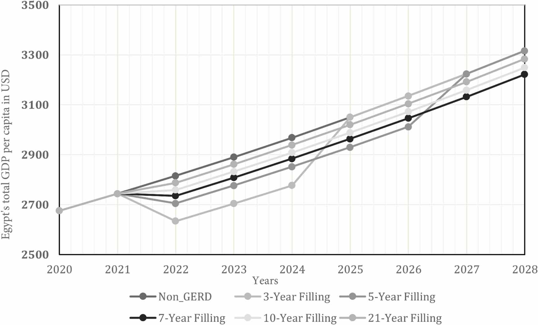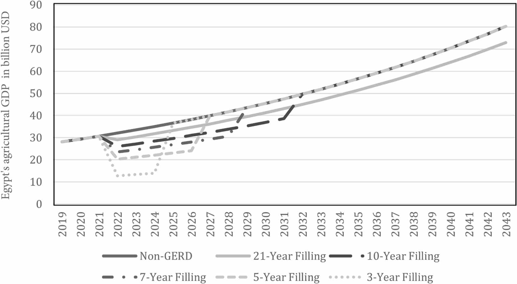 Growth rate GDP projections for agriculture and for total GDP per capita can be found in figures 4 and 5, respectively, considering the sum of the water losses in figure 2. In the years 2022, 2023 and 2024, our first order model suggests an equivalent agricultural GDP losses arising from the unmitigated total water budget deficit, for the total filling period, of ∼$51 billion for the 3 years filling scenario, ∼$28 billion for the 5 years filling scenario, ∼$17 billion for the 10 years filling scenario, and ∼$10 billion for the 21 year filling scenario. These economical losses reflect the degradation in crop production due to the unmitigated deficit in necessary irrigation water to maintain agricultural activities. The above reduces the existing cultivation area as explained in sections 2.4 and 3.2 and hence the associated agricultural GDP. The losses in the agricultural sector (i.e. Agricultural GDP) will decrease the total projected GDP per capita for Egypt for the years 2022, 2023 and 2024 from $ 2815, $ 2890 and $ 2968, for the case without the GERD, down to $ 2633, $ 2703 and $ 2777 when accounting only for the agricultural losses arising from the unmitigated total water budget deficit under the GERD short-term filling scenarios.