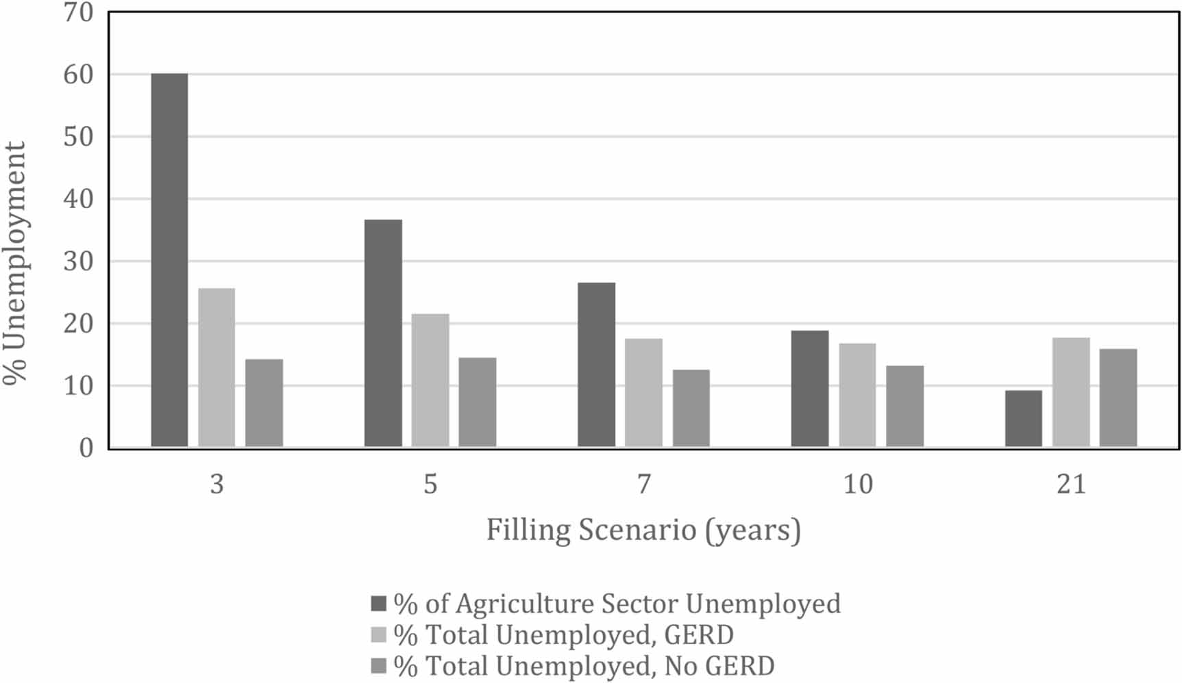 Standard image High-resolution imageOur economic impacts model's accuracy is limited by a few key factors. Firstly, it does not account for time the Nile will need to restore full flow after GERD filling ends, and as a result, does not account for the economic effects in the years following the GERD's filling. The immediate upshoot in GDP during the year after the filling period ends is highly unlikely as many of the environmental and socioeconomic impacts could be irreversible. The 10 to 21 years filling scenarios, with the lowest net present value impact on Egypt's GDP, thus appears to be the best scenarios with long-term manageable economic impacts to a country that is already highly stressed by socio-economic instabilities and rapid increase in population. Secondly, the model hypothesizes that for every unit loss in the Nile River inflow, its distributaries will experience an equal unit loss of water. The downstream impacts such as land loss and available water for industrial and municipal use are more likely to be manifested as a non-linear decrease at a much higher rate for every unit decrease in the Nile itself. Furthermore, the model assumes that the distribution rates of water across agriculture, industry, and municipal use will remain unchanged. Lastly, these figures do not include the economical impacts on the growing food manufacturing and processing sector which contributed to ∼6% of Egypt's GDP in 2019 (USDA, 2020). Other service industries connected to industry and agriculture are likely to experience significant consequences because of decreased production capabilities. As such, the results on the equivalent decrease in the GDP per capita and the rise of unemployment should be considered as lower limits, the economic damage considering all the above factors will be higher.