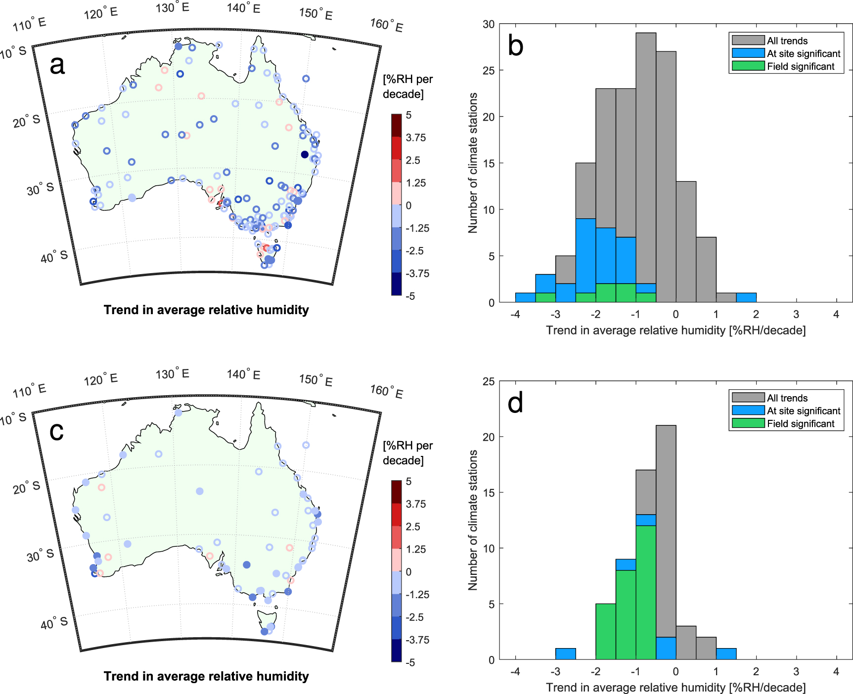 The analysis is extended back to 1955 using two observations per day (figure 2(c)). Fewer stations were operating in the middle of the 20th century (Trewin 2013) and hence the number of stations is reduced. Trends in relative humidity are less strong (figure 2(d)) compared to the analysis starting in 1988 (figure 2(b)). However, both the map (figure 2(c)) and histogram (figure 2(d)) still present decreasing relative humidity, with an average trend of −0.6%/decade and 90% of sites showing negative trends, with 47% of these field significant. This reduced magnitude in the decreasing trend is consistent with the greatest warming occurring in the most recent decades. Figures 2(a) and (c) show no clear regions of positive or negative trends, suggesting that decreasing relative humidity is uniform across the continent.