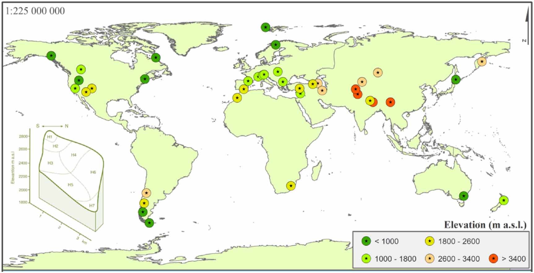 Figure 1. VB study sites in mountain ranges around the world. Colours denote the minimum elevation of each basin. In the bottom-left corner is a representation of the VB and its seven HRUs that were modelled in this study.