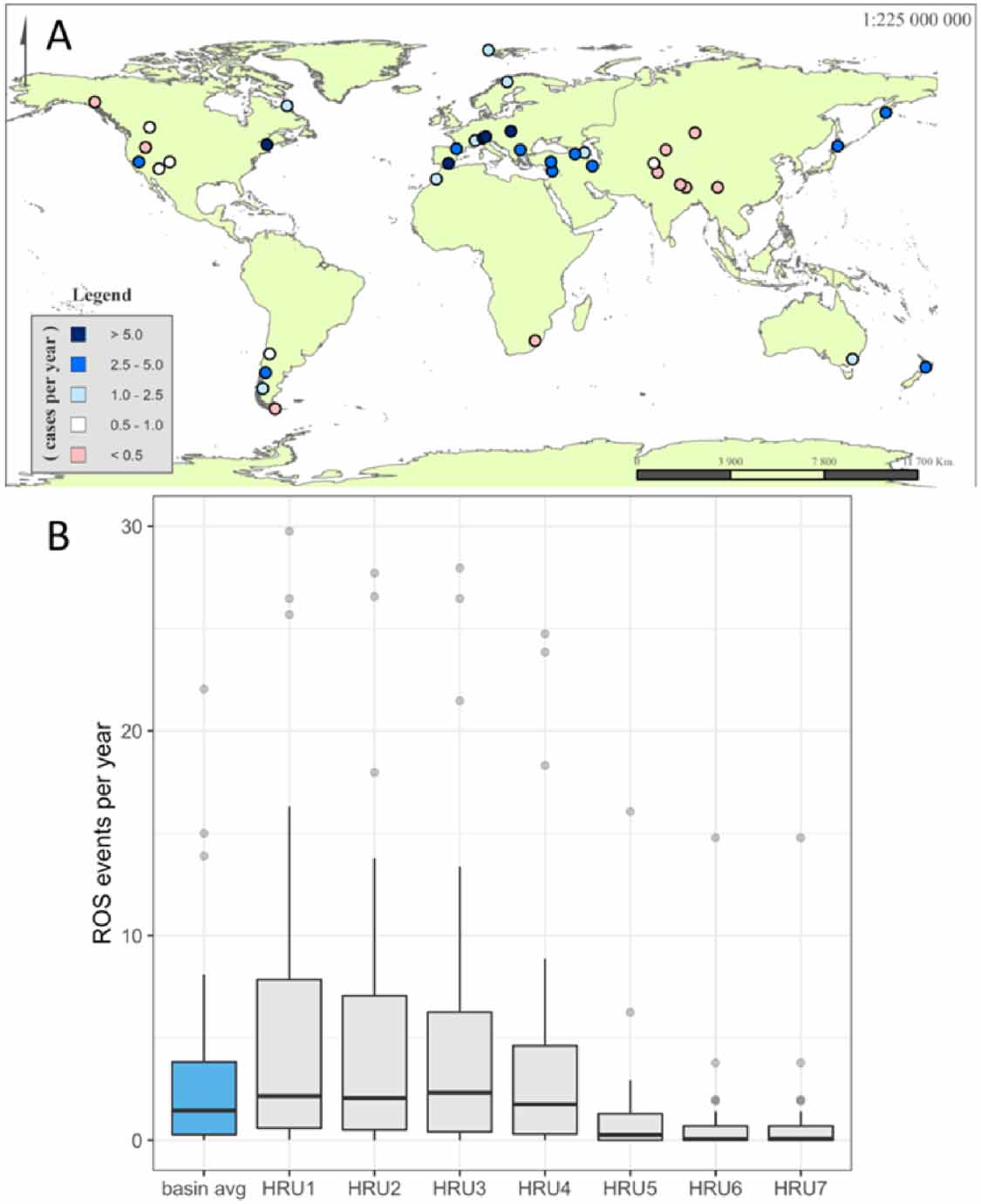 Figure 2. (A) Map of different average annual ROS frequency in the 40 VBs under unperturbed conditions, and (B) boxplots showing the variability in the mean number of ROS events per year among the VBs (line is the median, box represents the 25th and 75th percentiles and bars the 10th and 90th percentiles, dots are outliers) at each HRU and the basin average. HRU1 is the summit area, HRU2 is the high plateau, HRUs 3 and 4 are the high north and south faces respectively, HRUs 5 and 6 are the low north and south faces respectively, and HRU7 is the bottom of the basin.
