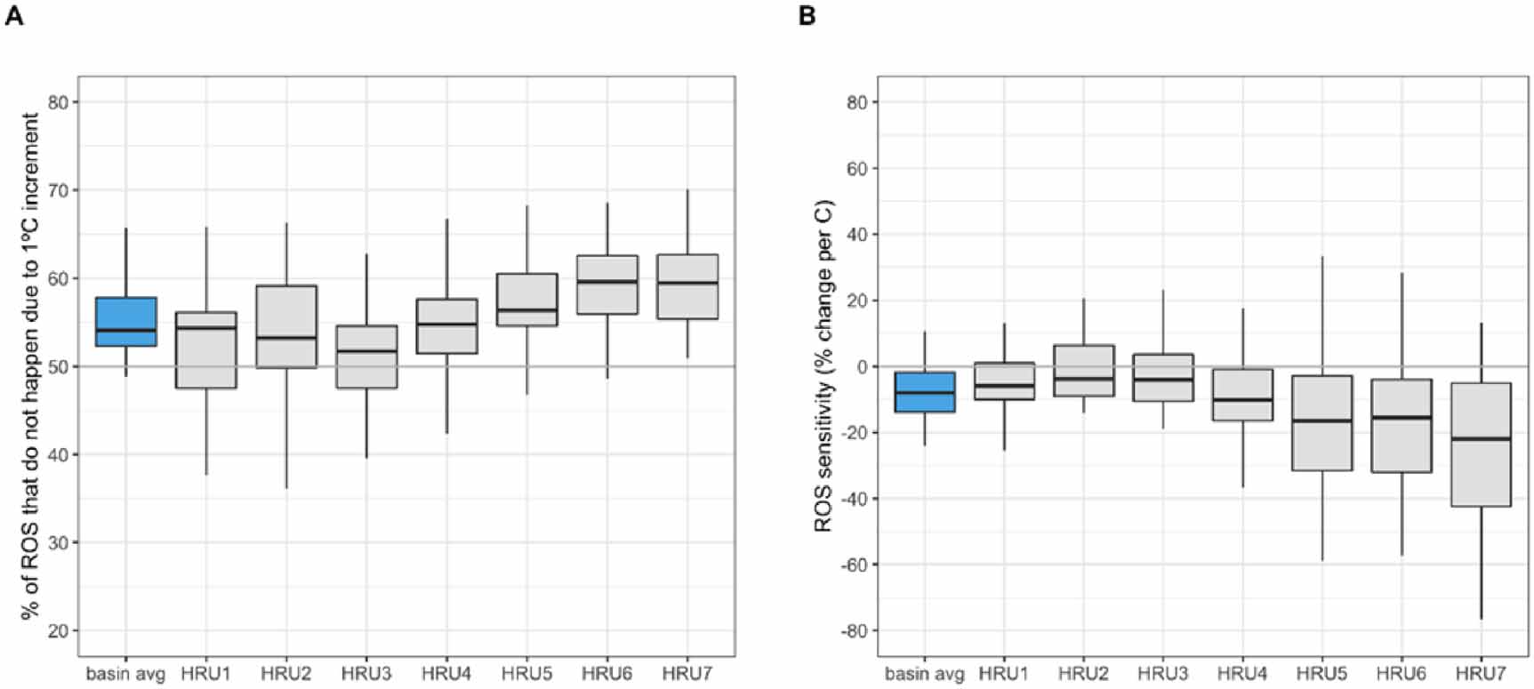 Figure 3. (A) Percentage of ROS events that do not occur due to 1 °C increment. (B) Average sensitivity (increase in %) per degree of warming of ROS occurrence at each HRU and the average for the basin. Line is the median, box represents the 25th and 75th percentiles and bars the 10th and 90th percentiles at each HRU and the average for the basin. HRU1 is the summit area, HRU2 is the high plateau, HRUs 3 and 4 are the high north and south faces respectively, HRUs 5 and 6 are the low north and south faces respectively, and HRU7 is the bottom of the basin.