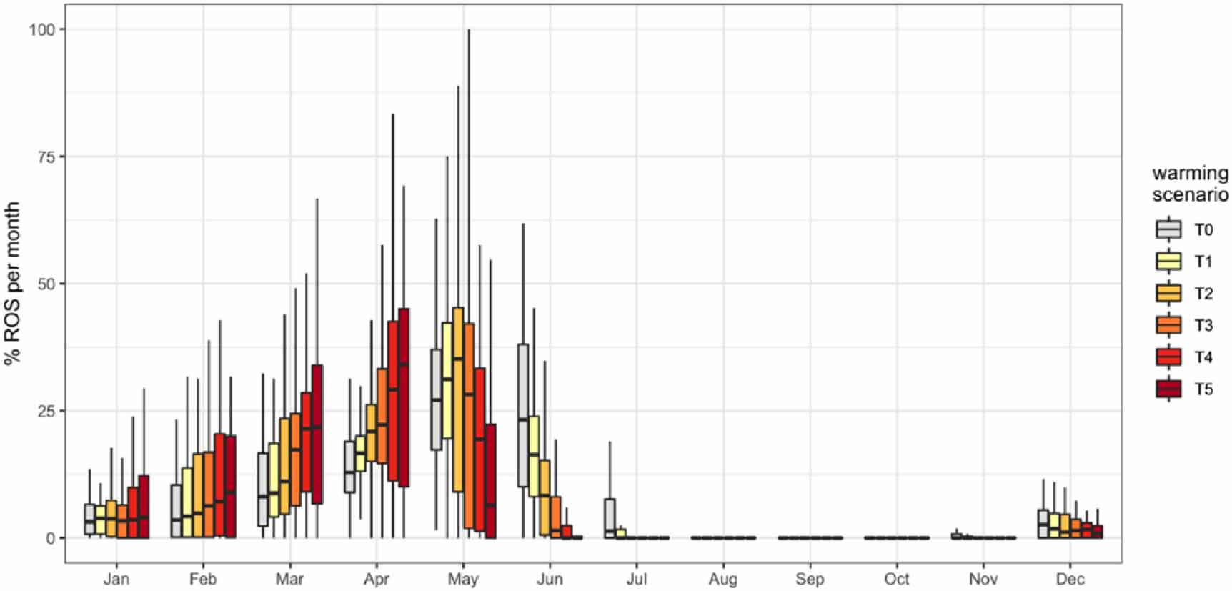 Figure 4. Variability in ROS relative frequency shown by VBs in each month of the year for the control period (T0: 1979–2012) and for progressive increases in temperature by +1 °C (T1) intervals to +5 °C (T5). Months in VBs located in the Southern hemisphere have been shifted 6 months in order to correspond with cold and warm periods as in the Northern hemisphere. The centre line is the median, the box represents the 25th and 75th percentiles and bars the 10th and 90th percentiles.