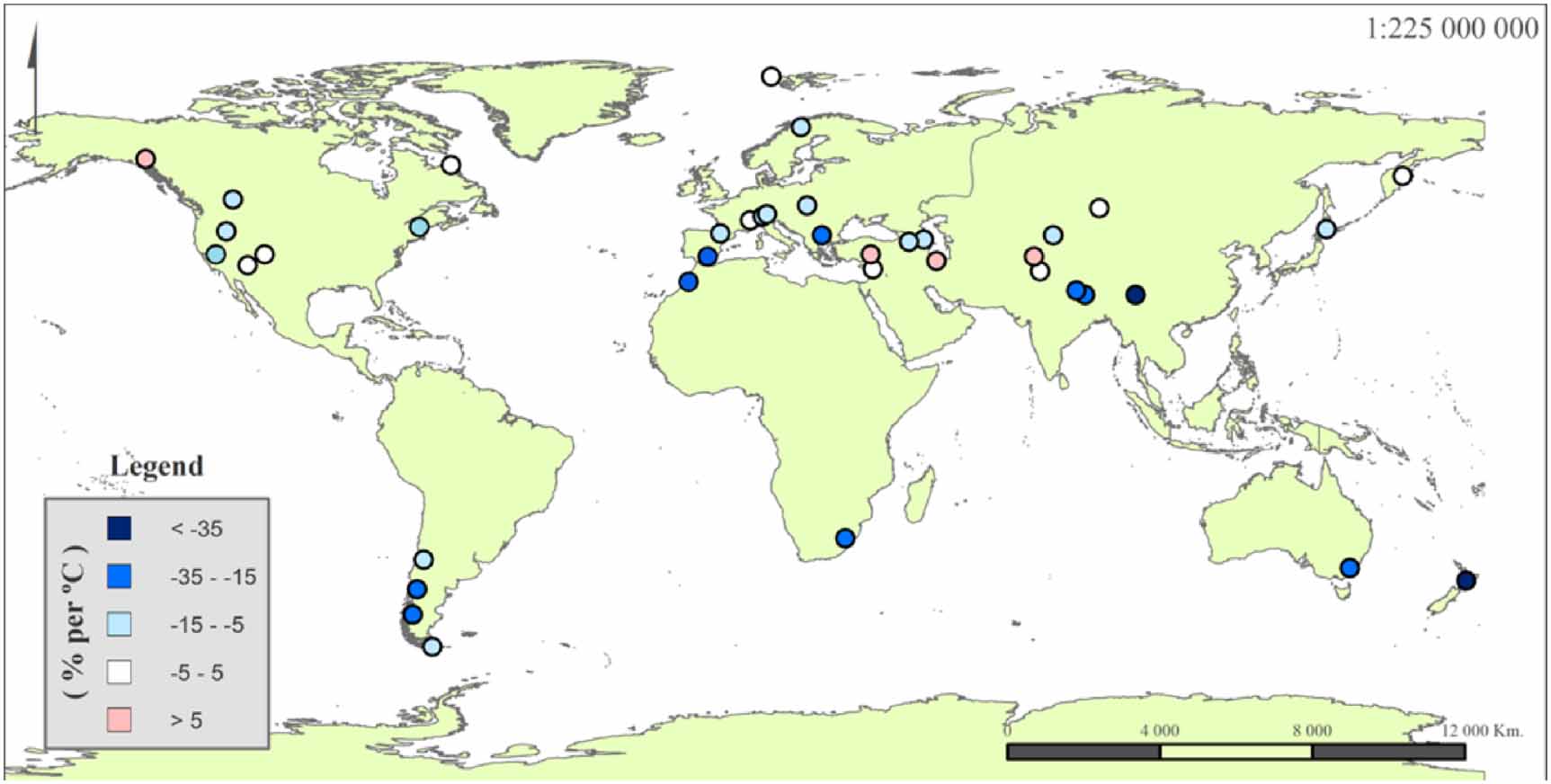 Figure 6. Geographical distribution of the sensitivity in frequency of ROS events to air temperature warming computed by the CRHM warming analysis (% of change per °C of warming).