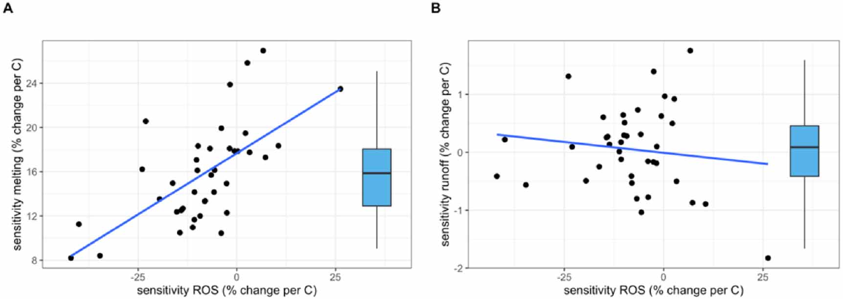 Figure 7. Change (%) in volume of snow melting per °C of warming and its relation to sensitivity of ROS occurrence (A). Change in total runoff during ROS per °C of warming related with sensitivity of ROS (B). Box plots inform about the overall variability in the sensitivity of snow melting and runoff among analyzed basins.
