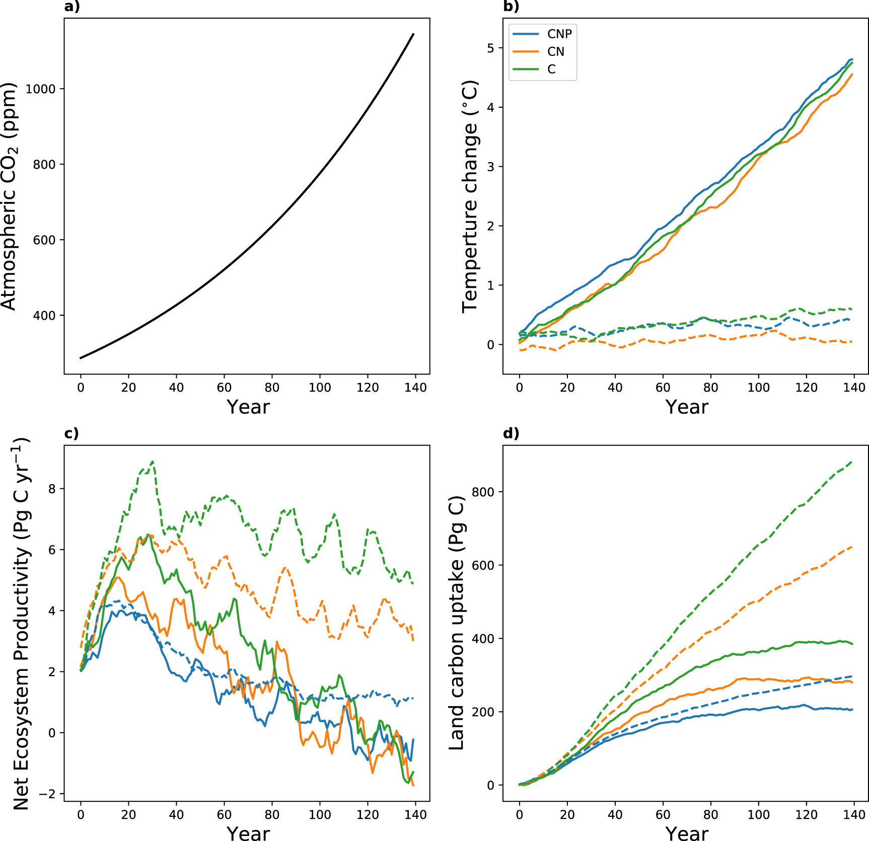 Figure 1. Change in (a) prescribed atmospheric CO2 concentrations, (b) global mean near-surface temperature (10-yr running mean), (c) Net Ecosystem Productivity (NEP; flux into the land, 10-yr running mean) and (d) land carbon uptake for the three configurations C (green), CN (orange) and CNP (blue). Results for the fully coupled runs (COU) are shown in solid lines and results for the biogeochemically coupled runs (BGC) are shown in dashed lines.