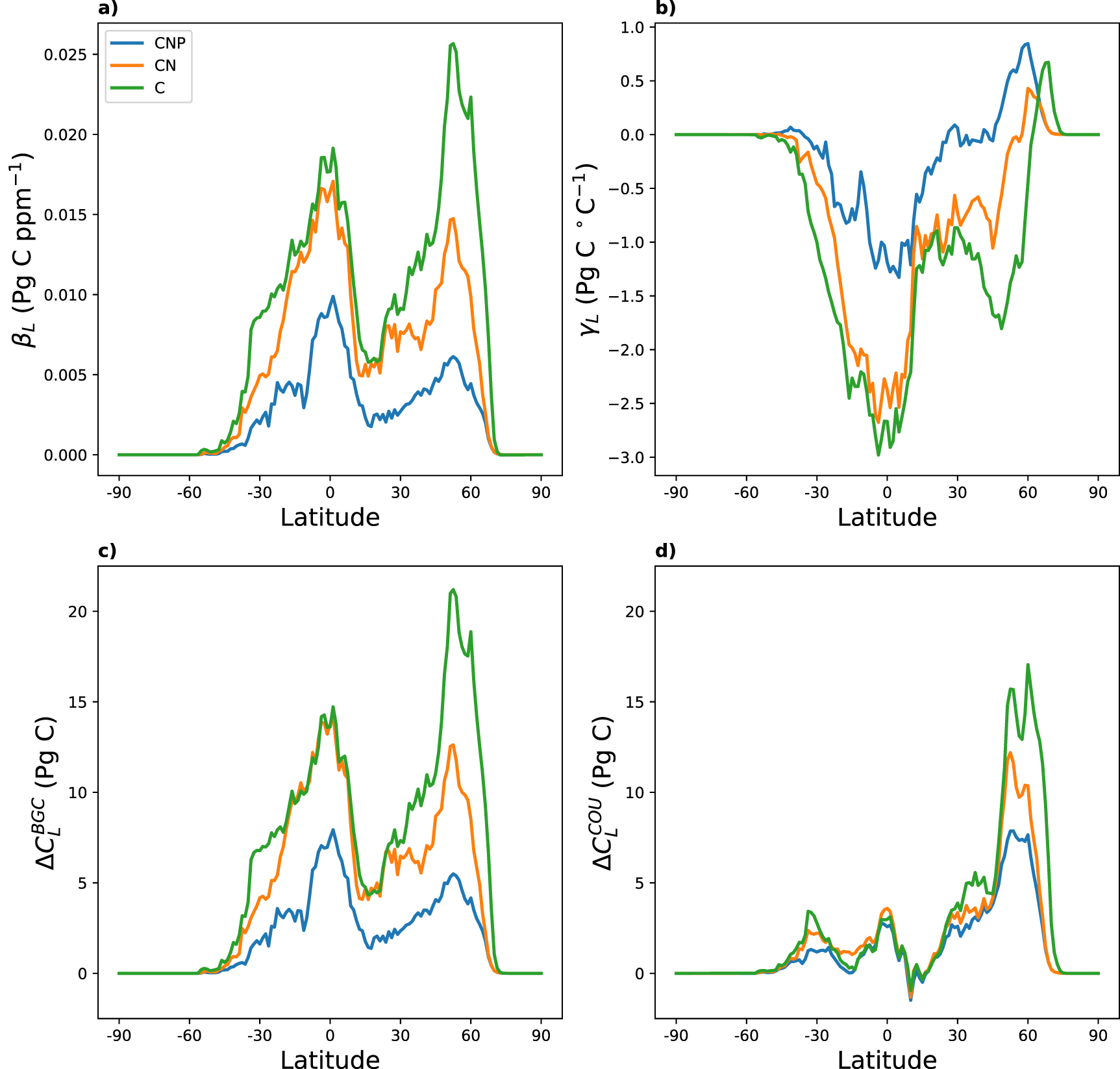 Figure 2. Latitudinal distribution of (a) the carbon-concentration (βL ) and (b) carbon-climate (γL ) feedbacks as well as the change in total land carbon stocks (over 140 years) for (c) the biogeochemically coupled runs (BGC) and (d) the fully coupled runs (COU) for C (green), CN (orange) and CNP (blue).