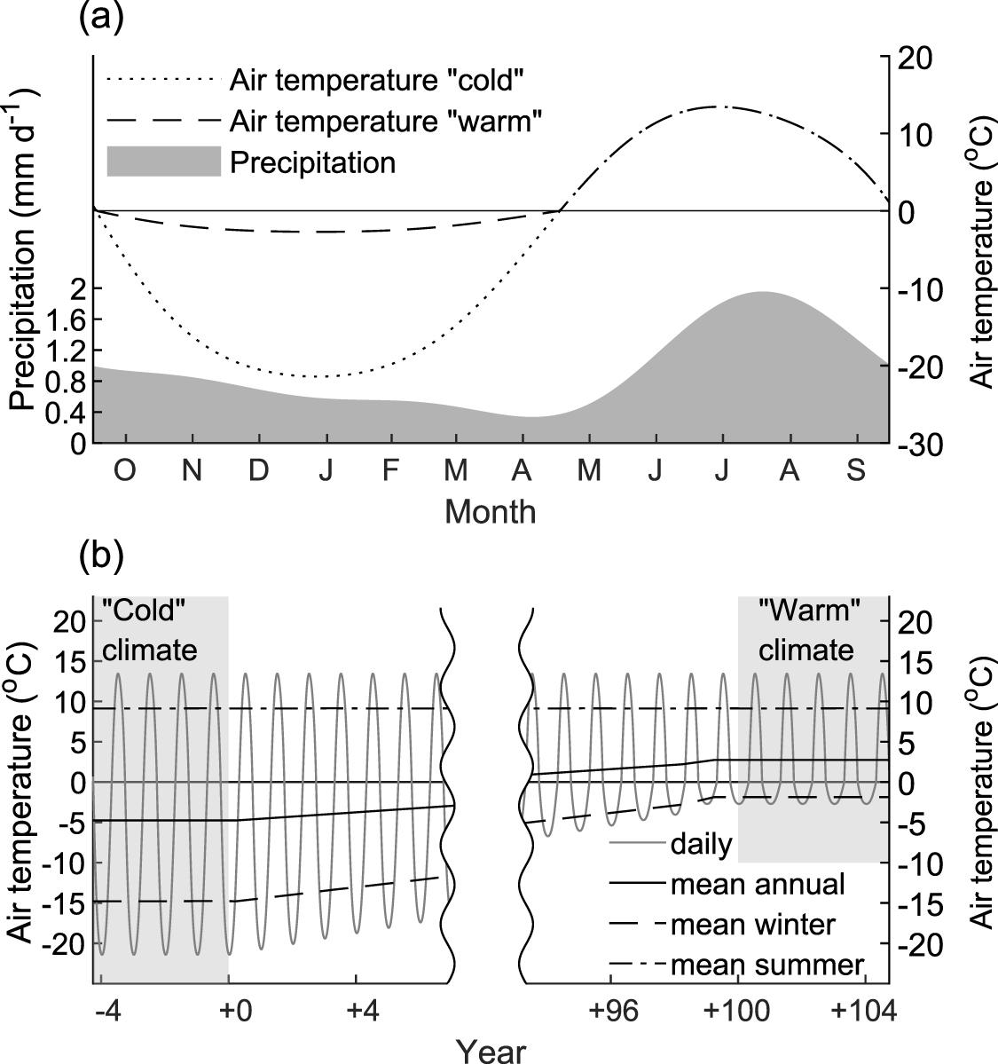 The model is forced by near-surface air temperature (Ta ) and precipitation (P) data. For each of the six model configurations described above we apply two atmospheric forcing scenarios: a warming scenario leading to permafrost degradation and a cooling scenario causing permafrost aggradation. Forcing scenarios are constructed as linear transitions (figure 2) of air temperature over 100 years between two steady climates, referred to as a 'cold' climate and a 'warm' climate (figure 2). The 'cold' climate represents current conditions and consists of annual cycles of air temperature and precipitation that are derived from averaging spatial means of the Central Interior Alaska climate division (over period 1970–2018) from the Climate Research Unit (CRU) dataset (Harris et al 2014). Mean annual air temperature for the steady 'cold' climate is −4.8 ∘C and annual precipitation is 340 mm yr−1.