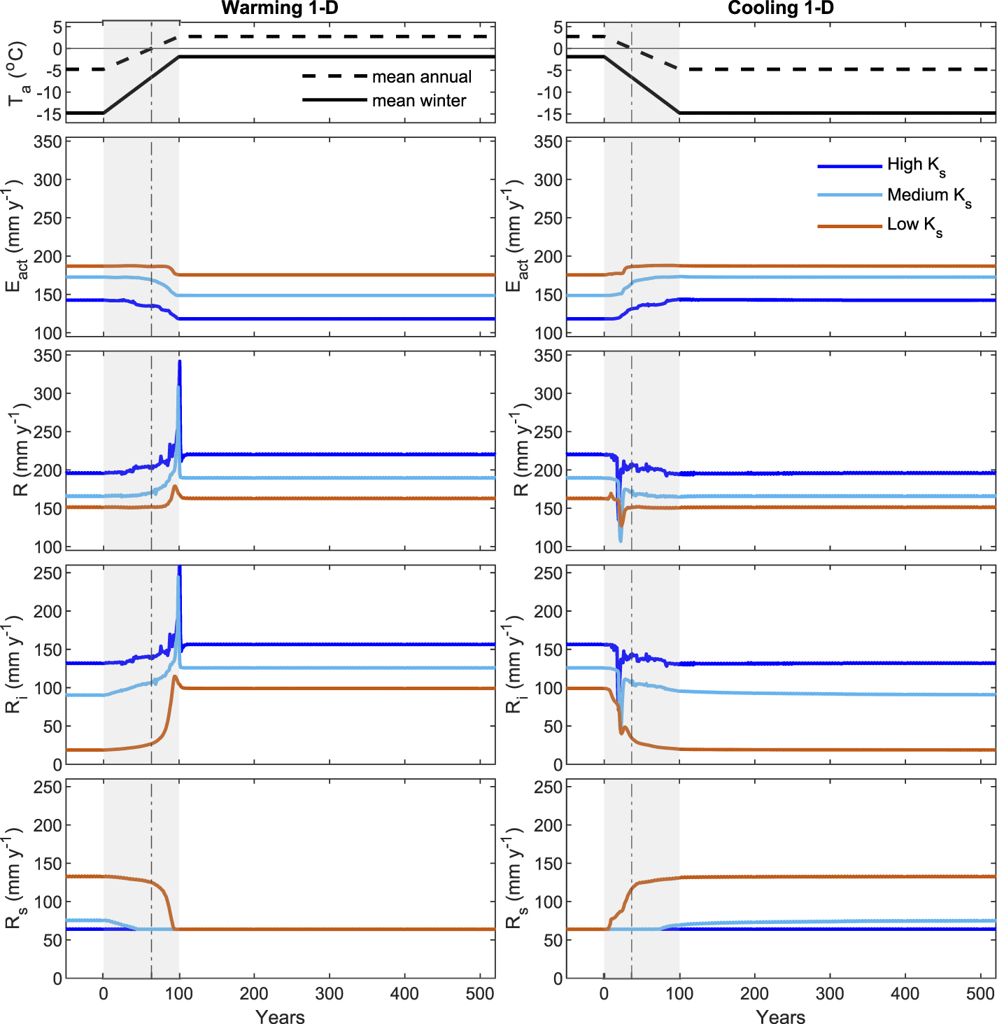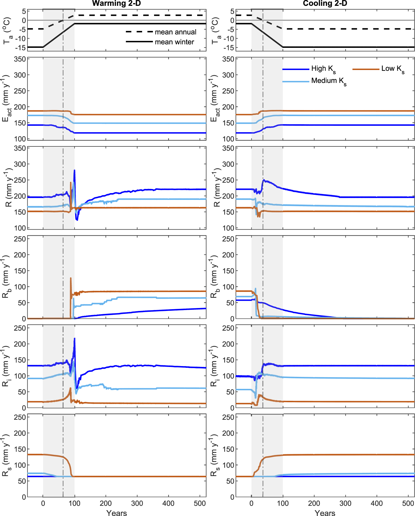 Under the cooling scenario we observe a similar behavior where long-term changes in evapotranspiration and surface runoff in the 2D configuration are similar to those in the 1D configuration. In contrast, total runoff, though showing similar overall long-term change between steady climates, exhibits a significantly different transient behavior than in 1D configuration, especially for the case of high