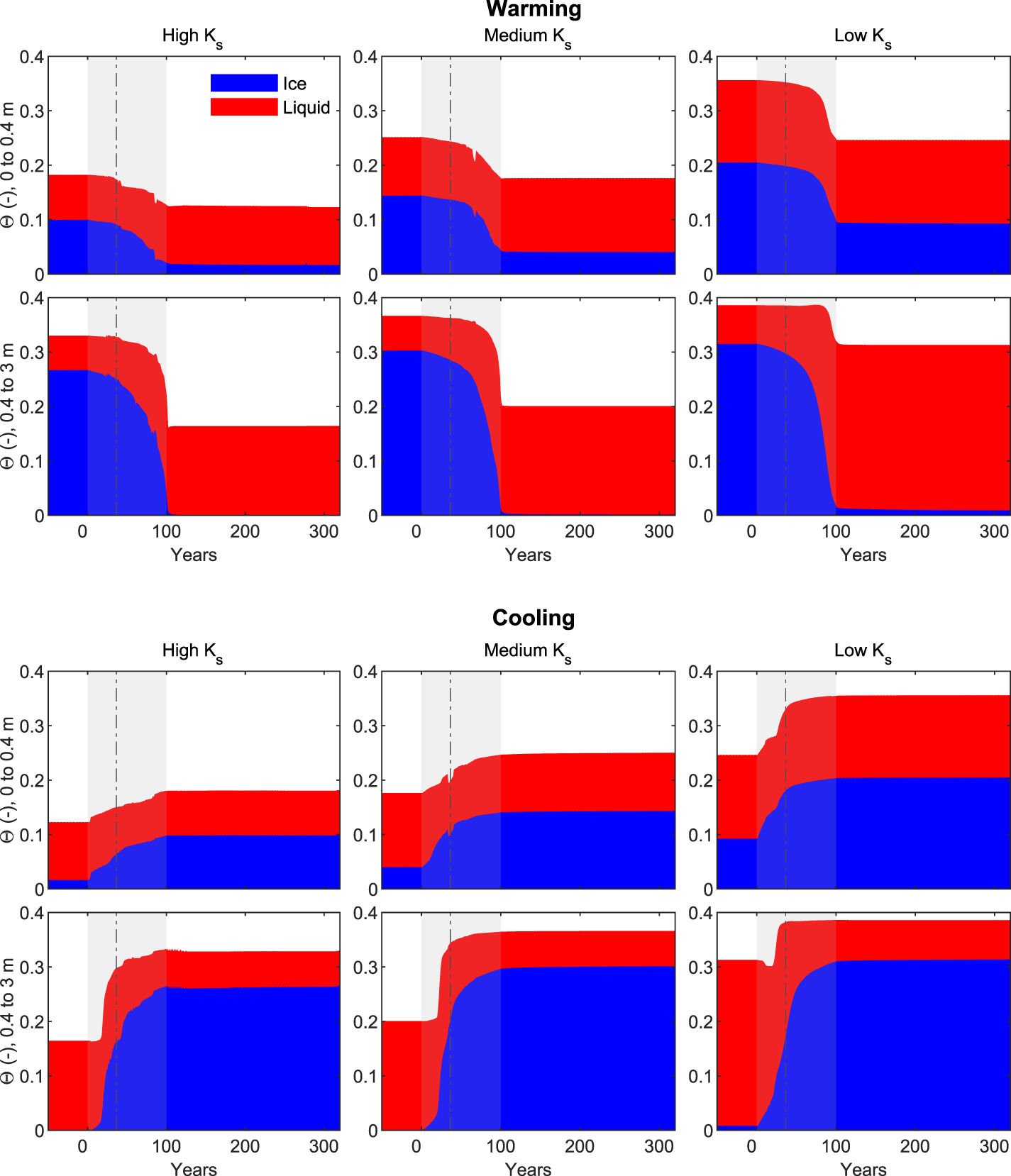) values (table 1) in 1D model configuration. Liquid and frozen components are stacked.
