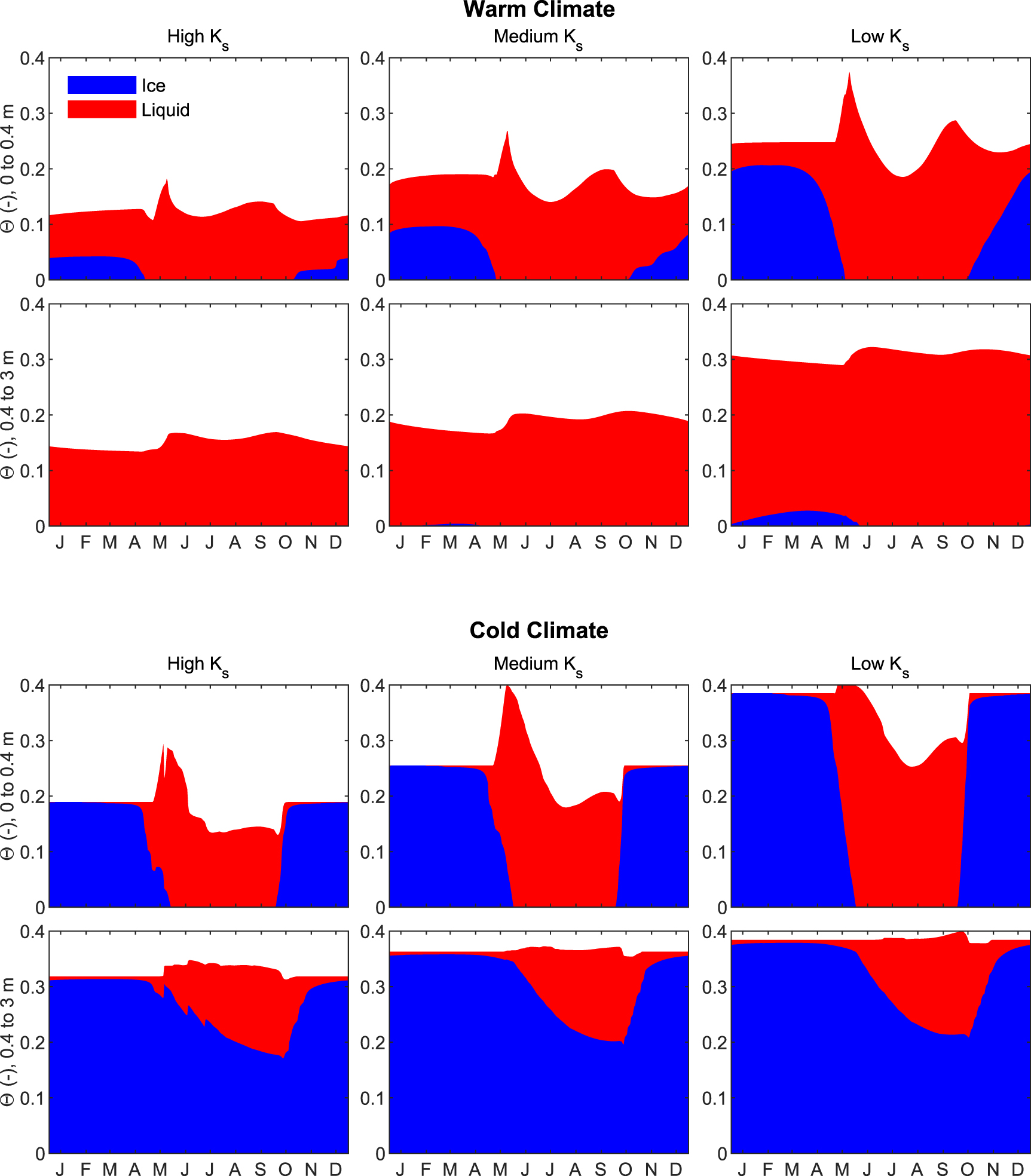 Figure 6. Annual cycles of volumetric soil moisture content (Θ) averaged for 0–0.4 m (evapotranspiration, surface runoff) and 0.4–3 m (interflow, baseflow) for steady 'warm' and 'cold' climates and three saturated hydraulic conductivity (