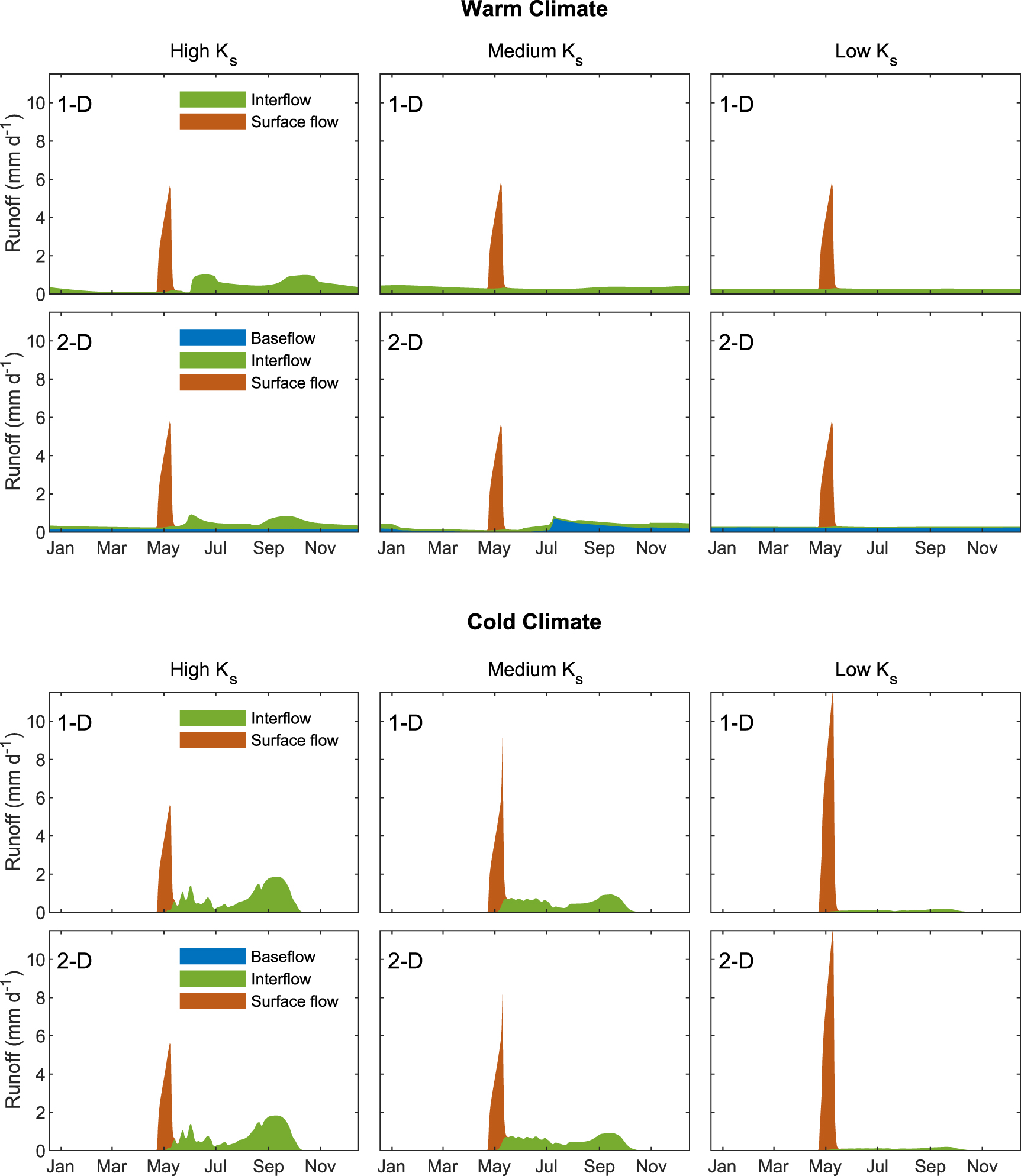 . In the 'cold' climate interflow contribution in both 1D and 2D (no baseflow occurs in the 'cold' climate) configurations is decreased. Most significantly in the low