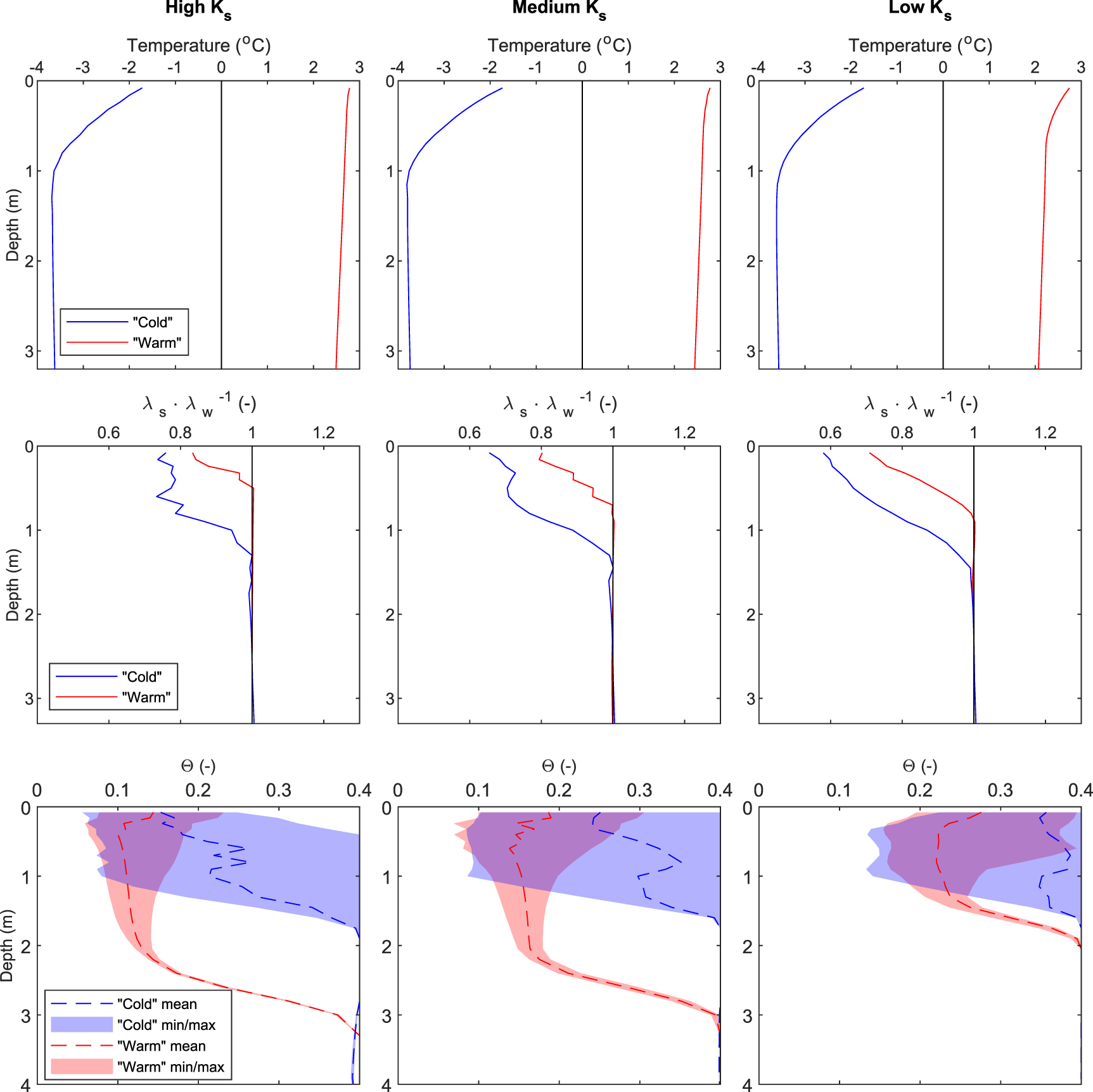) thermal conductivity (middle) and mean annual soil moisture (Θ, includes liquid water and ice) profiles with annual minima and maxima (bottom) for 'cold' and 'warm' steady climates. Results for three saturated hydraulic conductivity (