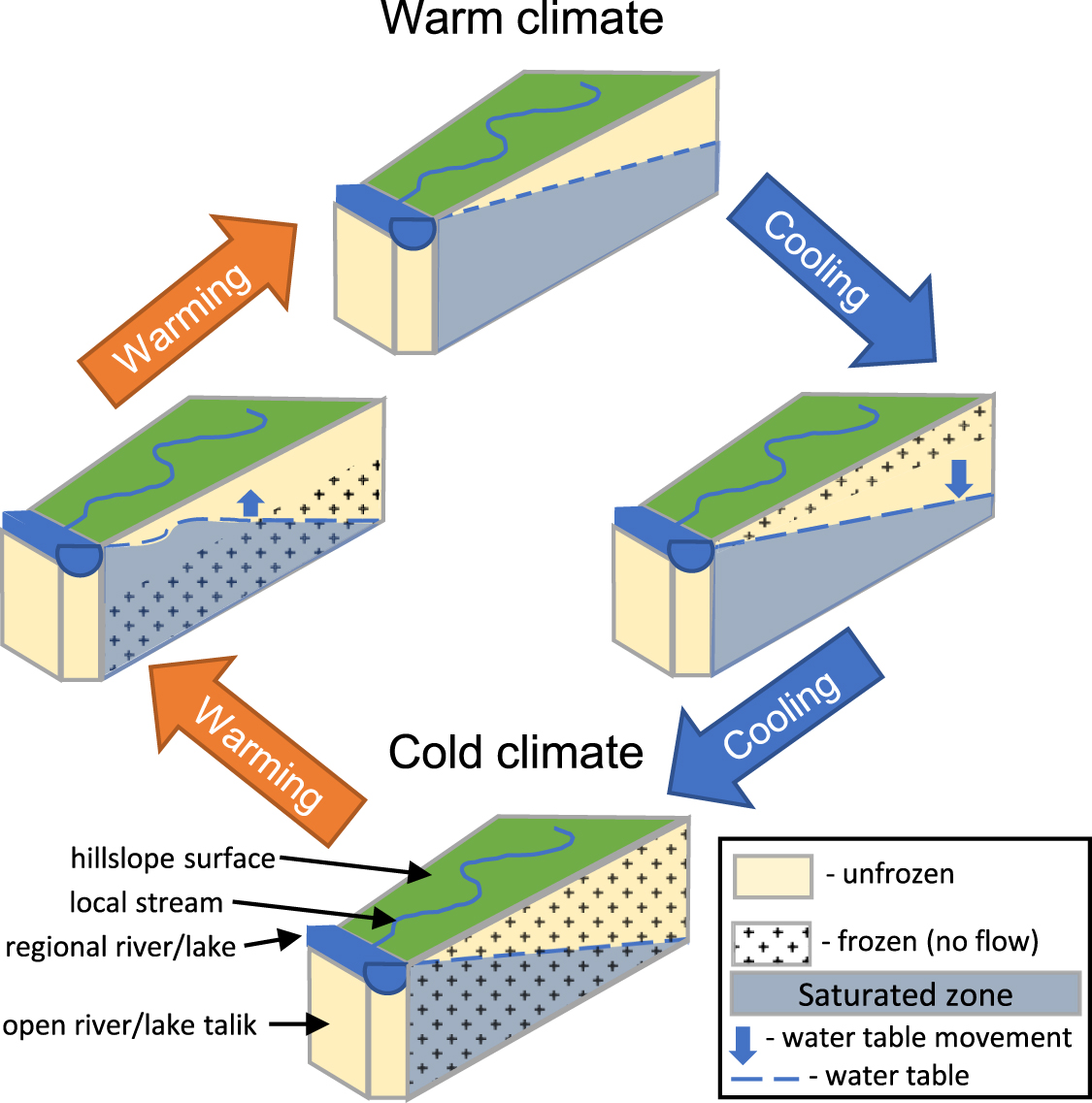 Figure 9. Conceptualized sketch of the evolution of the distribution of frozen/unfrozen soil and unsaturated/saturated zone in the idealized watershed in response to the transition between the warm and cold steady climate and vice versa.