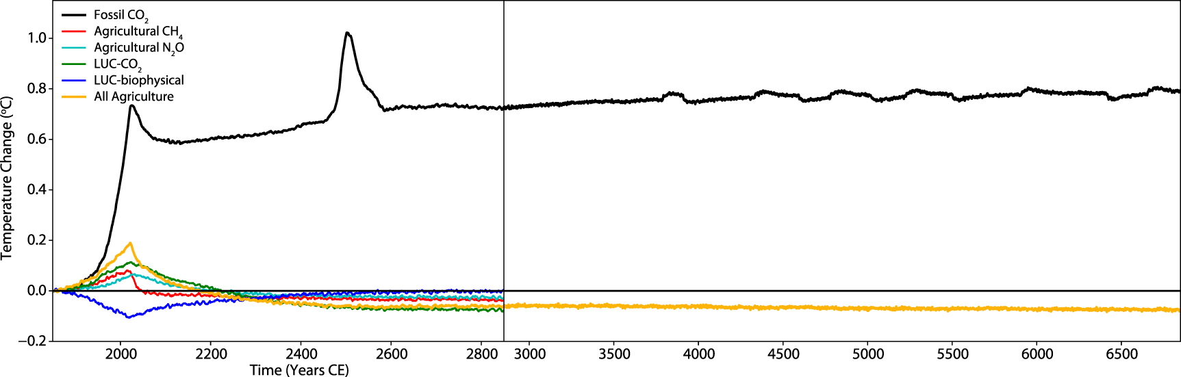 To illustrate this effect explicitly, a series of zero emissions commitment experiments were conducted with the University of Victoria Earth System Climate Model (UVic ESCM, section 2.1) wherein fossil fuel, agricultural emissions and/or land-use cease in year 2020 (see supplementary information S1 (available online at stacks.iop.org/ERL/16/125010/mmedia)). The results of these simulations are shown in figure 1. The simulations suggested that by the 2050s half of the industrial era agricultural warming has dissipated, and by the 2260s industrial era agricultural warming has dissipated entirely (figure 1). Although these results are for only a single climate model, and post emission cessation inter-model climate trajectories vary substantially [15], the basic principle is evident: by eliminating emissions from agricultural activities, agricultural climate warming is likely reversible on human time-scales, while warming from burning fossil fuel CO2 emissions is not.