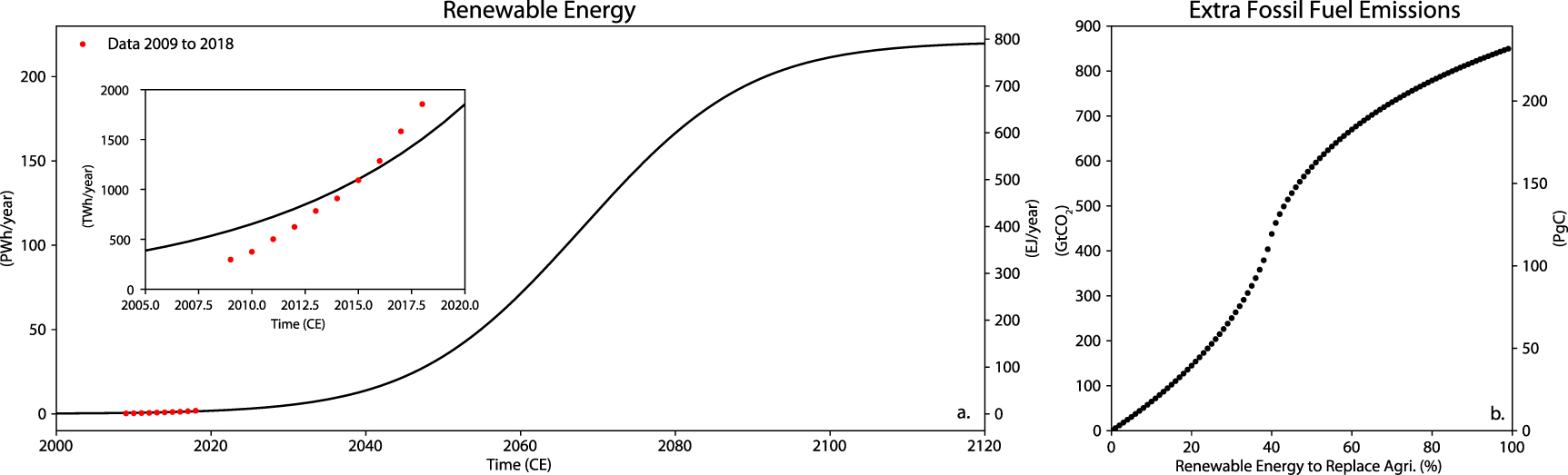 Figure 2. (a) Idealized model of renewable energy deployment. Inset zooms in on data to model comparison, showing that observed renewable energy installation rate (slope of the curve) is higher than that required by the model. Data is from International Renewable Energy Agency [40]. Electricity generation is shown (not system capacity). (b) Additional cumulative emissions of CO2 from diverting renewable energy to bacilliculture.