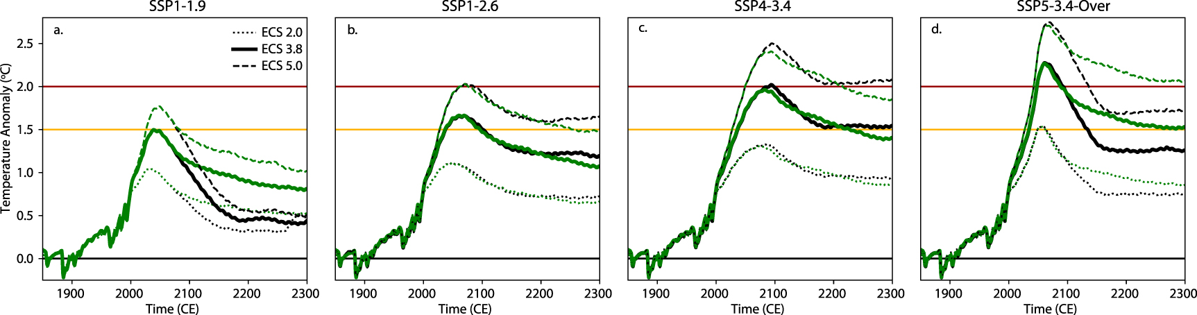 Figure 4. Results for standard simulations (black lines) and bacilliculture with no negative emissions simulations (green lines) for four SSP-based temperature overshoot scenarios. Global mean temperature anomalies relative to pre-industrial (1850–1900 mean). Amber horizontal line is the 1.5 ∘C guardrail and crimson line is the 2.0 ∘C guardrail [34]. ECS is equilibrium climate sensitivity.