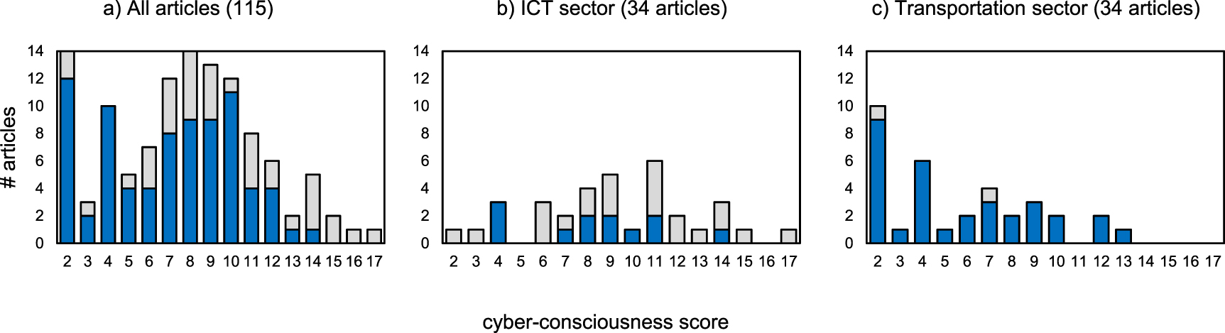 Figure 2. Cyber-consciousness score histograms; a) All articles, b) ICT sector, c) Transportation sector Blue: Quantitative articles; Gray: Qualitative Articles.