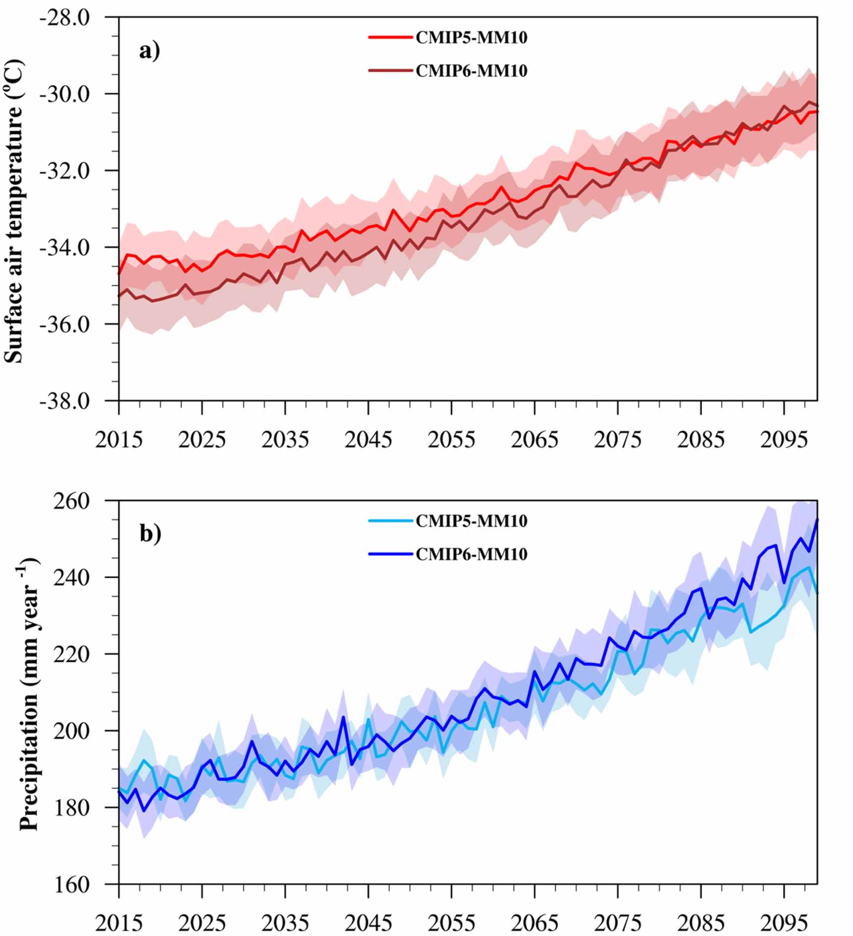 Figure 2. Long term changes in surface air temperature and precipitation rate over the Antarctic landmass. (a) Mean value of surface air temperature (in °C) and (b) precipitation rate (in mm yr−1) in CMIP5-MM10 and CMIP6-MM10 models projected from the best ten models. The shaded areas represent the standard deviation of the ensemble MM10 mean.