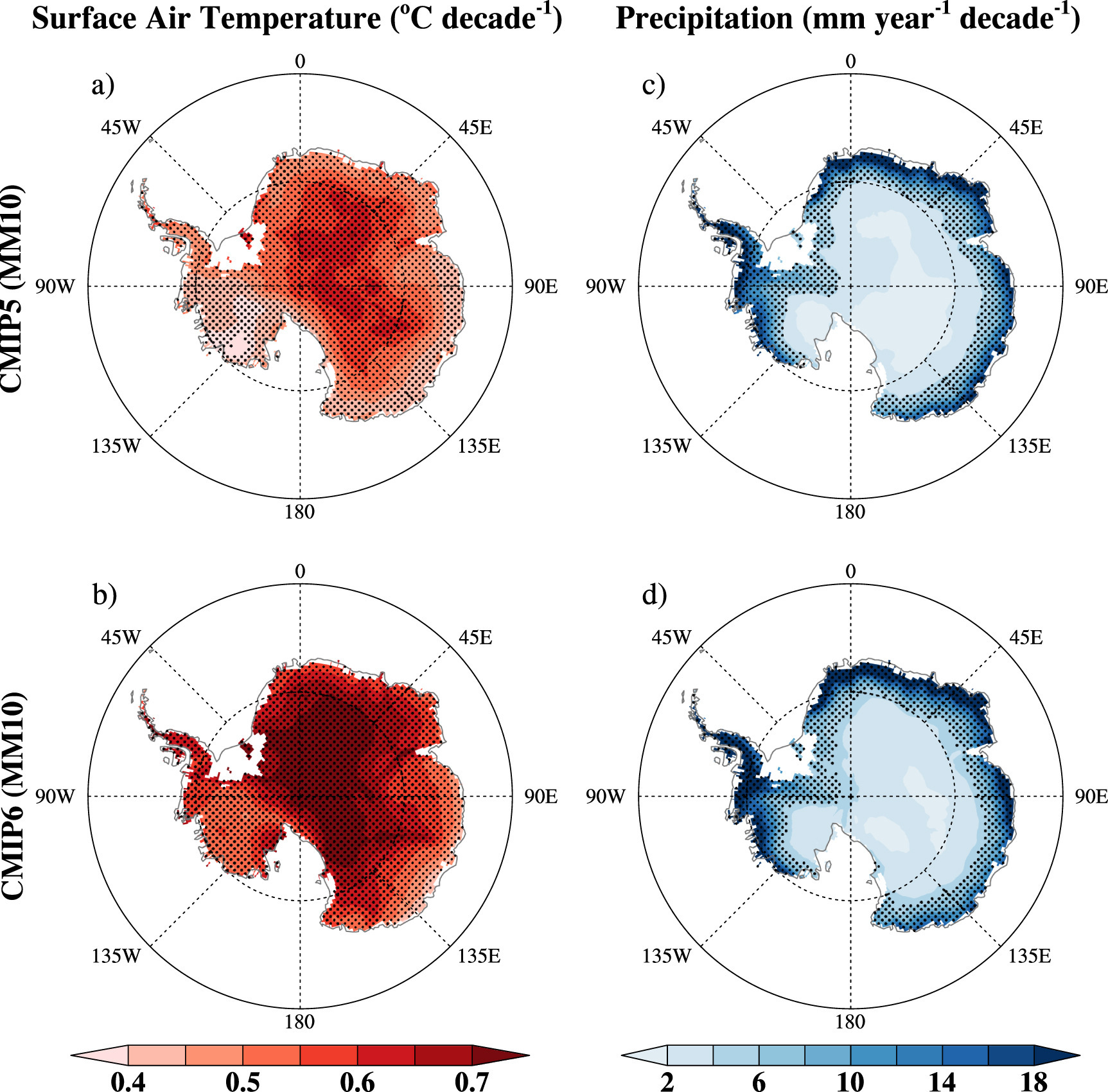 Figure 3. Spatial distribution of the decadal trends of surface air temperature and precipitation rate over Antarctica. (a) Mean value of surface air temperature (in °C per decade) and (b) precipitation rate (in mm per year per decade) in CMIP5-MM10 and CMIP6-MM10 models estimated for future projections from the best ten models for the period 2015–2099. The stippling in the figures denotes that the values are significant at a 99% confidence level.