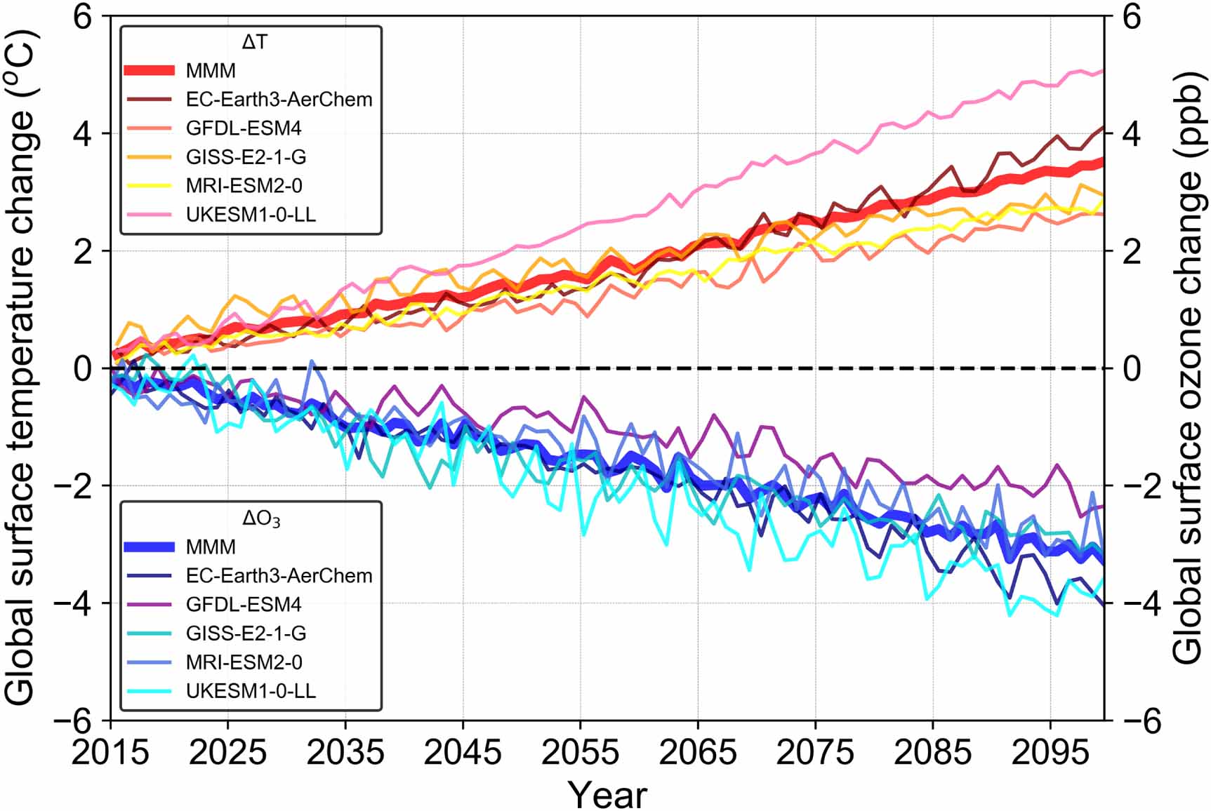 Figure 1. Time series of global annual surface ozone change (ssp370SST-ssp370pdSST) and global annual surface temperature change (ssp370SST-ssp370pdSST) during the time period from 2015 to 2100, for the individual CMIP6 models (GFDL-ESM4, UKESM1-0-LL, MRI-ESM2-0, EC-Earth3-AerChem, GISS-E2-1-G) and the multi-model mean (MMM).