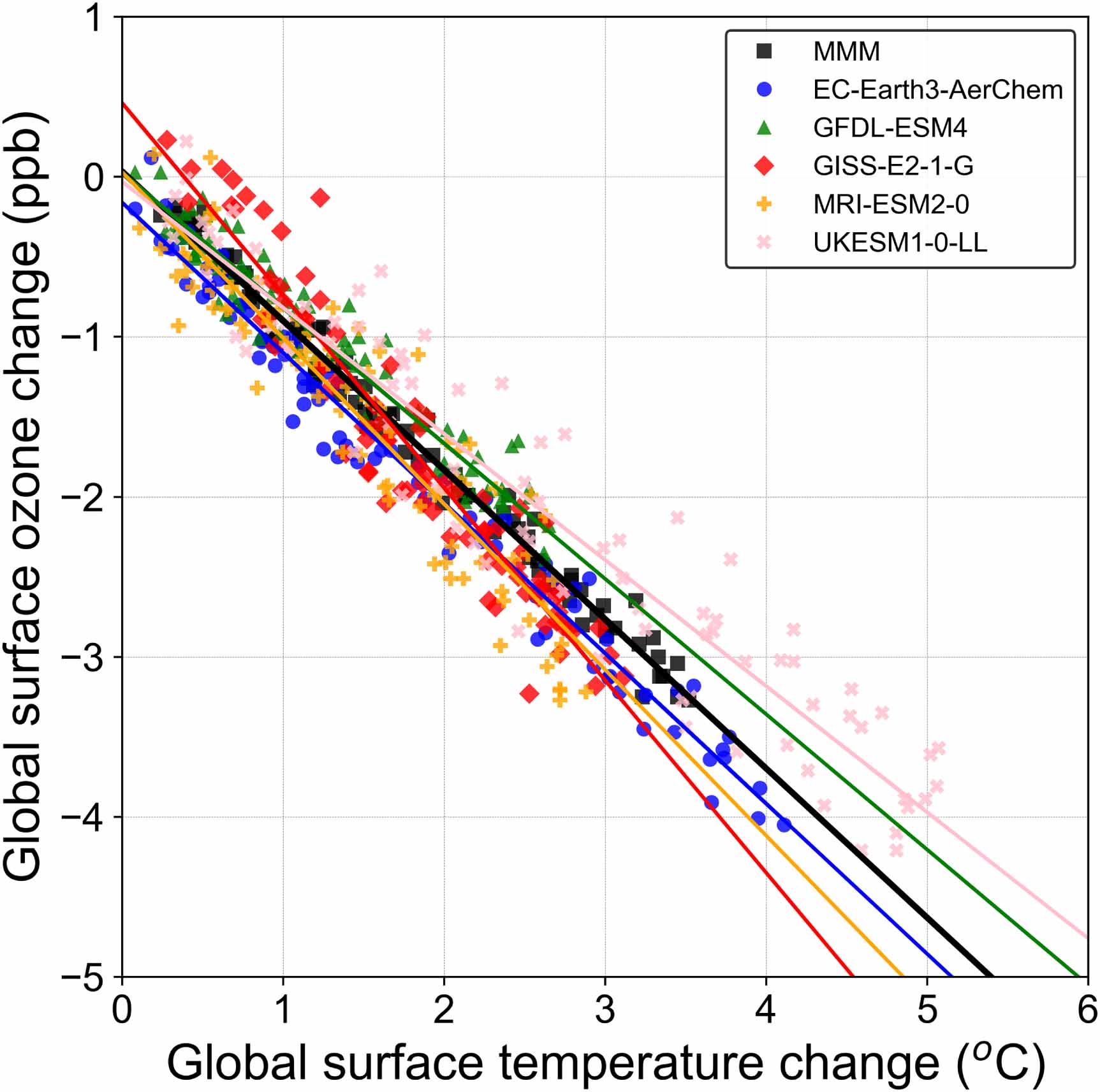 Standard image High-resolution imageFigure 2. Scatter plot of global annual surface ozone change (ssp370SST-ssp370pdSST) versus global annual surface temperature change (ssp370SST-ssp370pdSST) over the period 2015−2100, for the individual CMIP6 models (GFDL-ESM4, UKESM1-0-LL, MRI-ESM2-0, EC-Earth3-AerChem, GISS-E2-1-G) and the MMM.