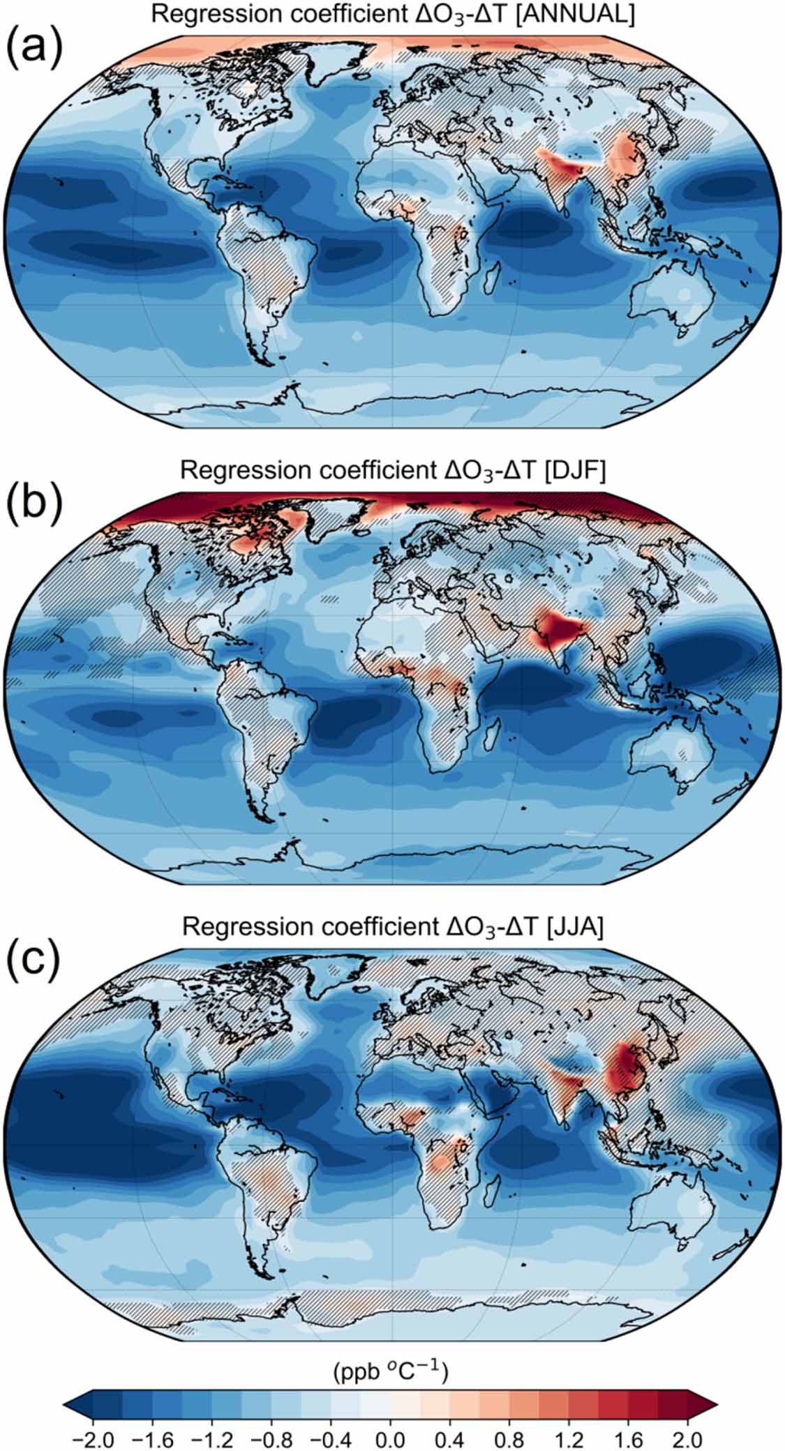 Figure 3. Spatial distribution of the regression coefficient of surface ozone change (ssp370SST-ssp370pdSST) over surface temperature change (ssp370SST-ssp370pdSST) (ppbv °C−1), ΔO3/ΔT, on an annual basis (a), for DJF (b), and for JJA (c), during the time period from 2015 to 2100, for the CMIP6 multi-model mean (GFDL-ESM4, UKESM1-0-LL, MRI-ESM2-0, EC-Earth3-AerChem, GISS-E2-1-G). The areas without hatching indicate that modelled regression coefficients are statistically significant (at the 95% significance level) and agree on the sign for at least four out of five models (80%).