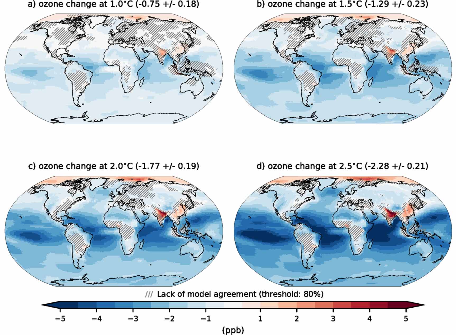 Figure 4. Multi-model annual mean change in surface ozone (ppbv) concentrations from five CMIP6 models (GFDL-ESM4, UKESM1-0-LL, MRI-ESM2-0, EC-Earth3-AerChem, GISS-E2-1-G) in response to a (a) 1.0 °C, (b) 1.5 °C, (c) 2.0 °C and (d) 2.5 °C increase in global mean surface air temperature. For each model the change in surface O3 concentrations is calculated as difference between the ssp370SST and ssp370pdSST experiments in the year when the difference in the global mean surface air temperature between the experiments exceeds the relevant threshold. The difference is calculated as a 20 years mean in surface ozone concentrations around the year when the temperature threshold in each model is exceeded. The multi-model change in global annual mean surface ozone concentrations (±1 standard deviation) is shown within parenthesis. Areas are hatched when less than four out of five models (80%) agree on the sign of change in surface ozone concentrations.