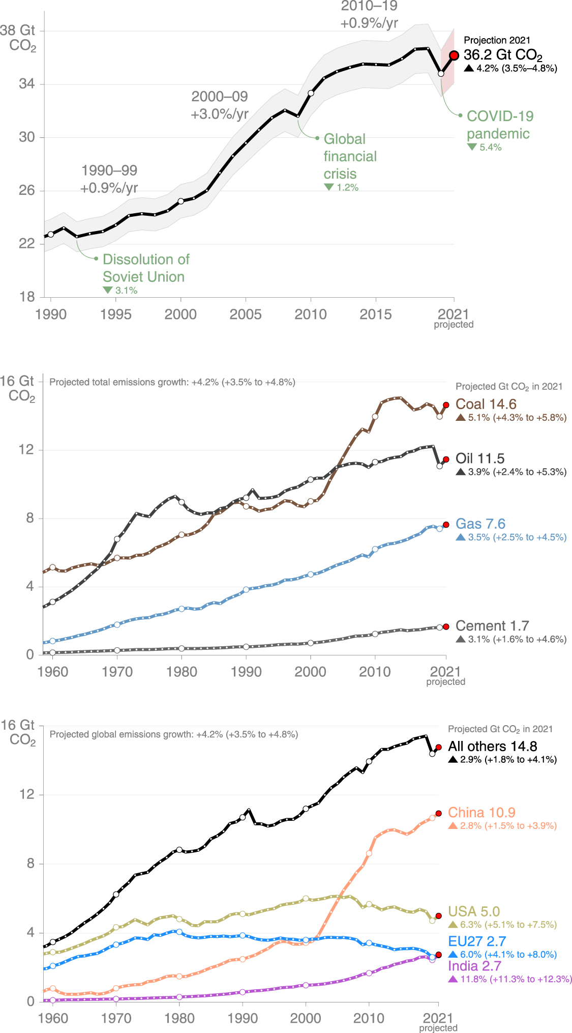 For 2021, our preliminary estimates are that global fossil CO2 emissions compared with 2020 levels rebounded by 4.2% (3.5%–4.8%) to 36.2 Gt CO2, nearly reaching 2019 emission levels of 36.7 Gt CO2 (figure 1) (Friedlingstein et al 2022). CO2 emissions in 2021 are expected to have risen compared to 2020 in every country and region. Our 2021 fossil CO2 emissions projections are based on energy data for coal, oil and gas for the first 9 to 12 months of the year for China, USA, EU27 + UK, and India, and a gross domestic product (GDP)-based projection for the Rest of the World. Full details are provided in Friedlingstein et al (2022).