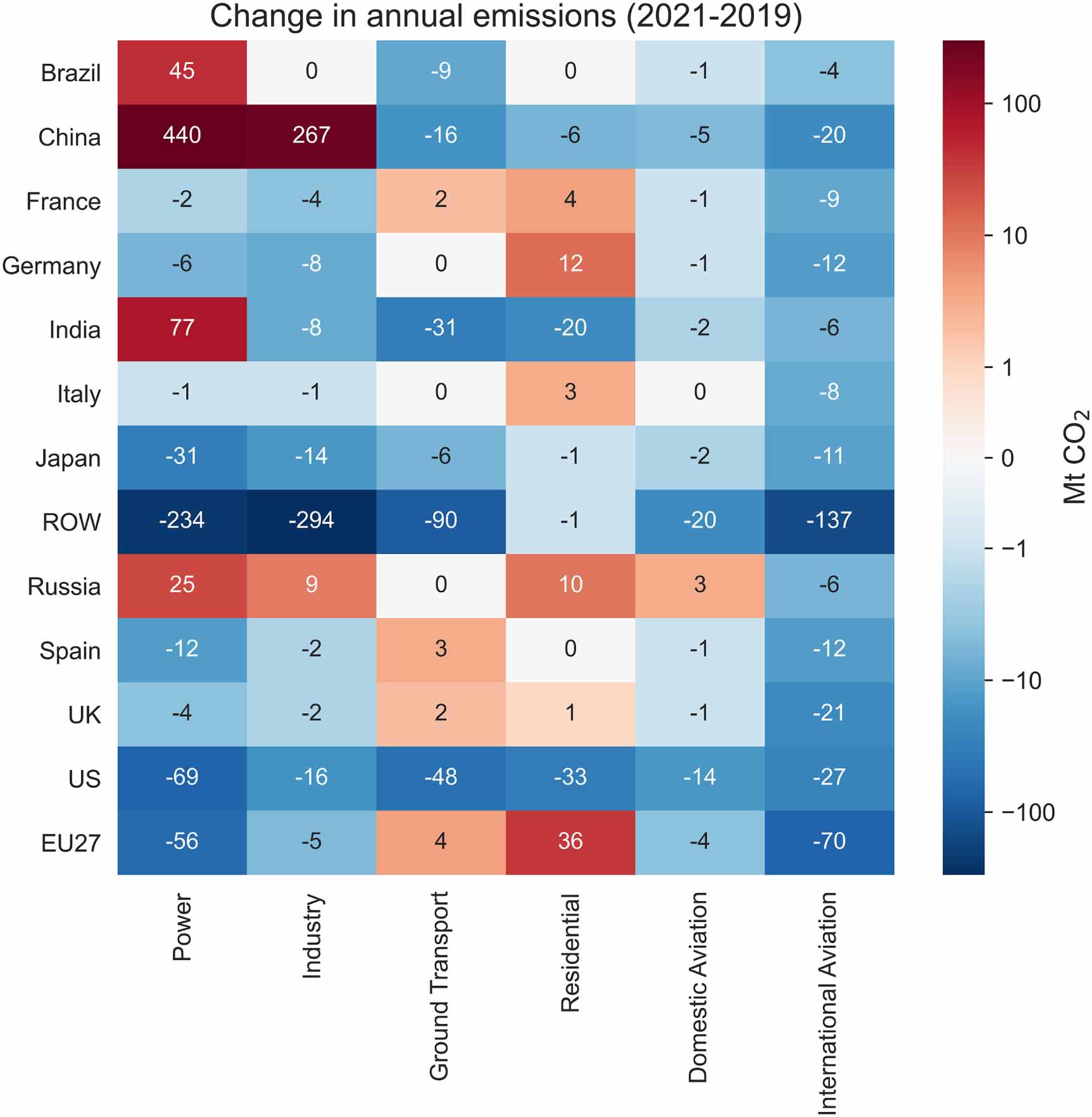 Figure 3. Change in fossil CO2 emissions (Mt CO2) by sector and country for the difference between year-end 2021 and 2019 emissions (Mt CO2) (data from Carbon Monitor, as described in Liu et al 2020).